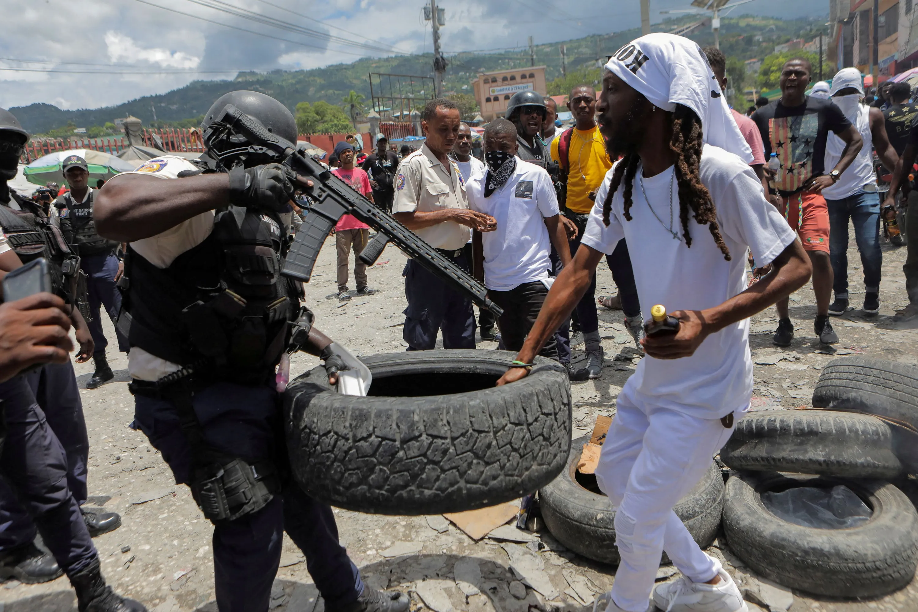 A police officer holding a gun confronts a demonstrator over setting a roadblock with a tire during a protest to demand justice for President Jovenel Moise a year after his assassination, in Port-au-Prince, Haiti on July 7, 2022. (Photo by Ralph Tedy Erol/Reuters)