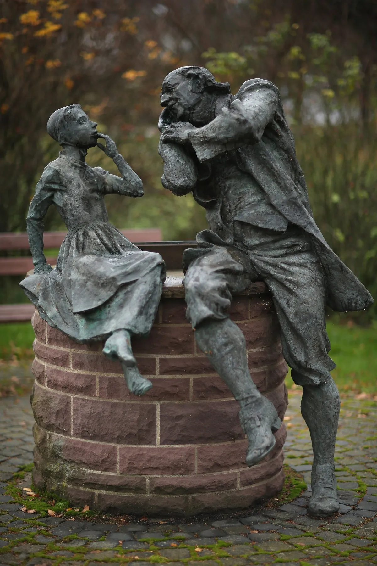 SCHOENEBERG, GERMANY - NOVEMBER 19: A bronze sculpture depicts a grandfather recounting a fairy tale to his dranddaughter on November 19, 2012 in Schoeneberg, Germany. Schoeneberg lies along the "Fairy Tale Road" (in German: Die Maerchenstrasse) that leads through the region between Frankfurt and Bremen where the Grimm brothers collected and adapted most of their fairy tales, which include such global classics as Sleeping Beauty, Little Red Riding Hood, Rapunzel, Cinderella and Hansel and Gretel, in the early 19th century. The 200th anniversary of the first publication of the stories will take place this coming December 20th. (Photo by Sean Gallup/Getty Images)