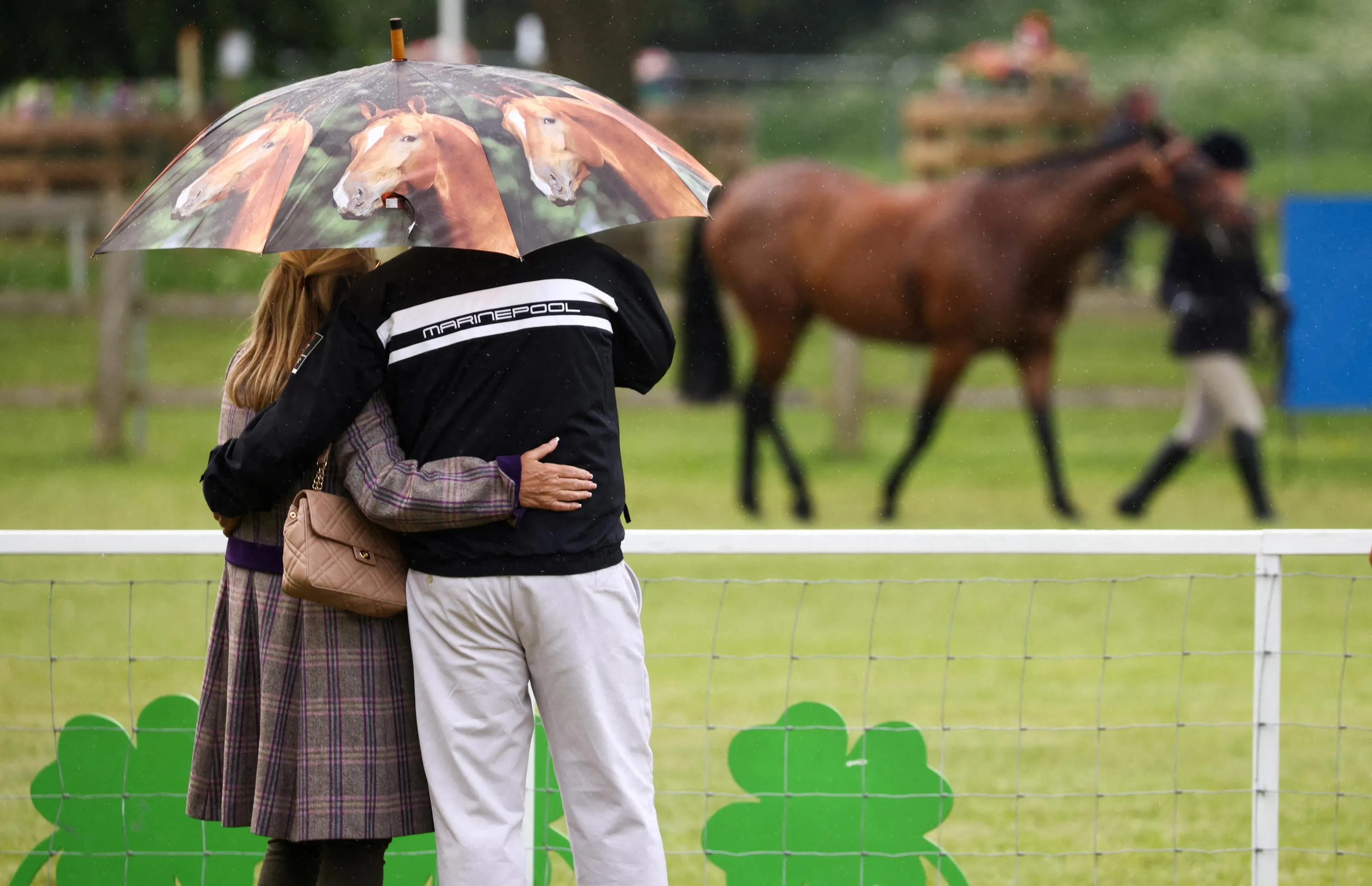 A couple shelters from a rainfall underneath a horse-themed umbrella during The Royal Windsor Horse Show in Windsor, Britain on May 15, 2022. (Photo by Henry Nicholls/Reuters)