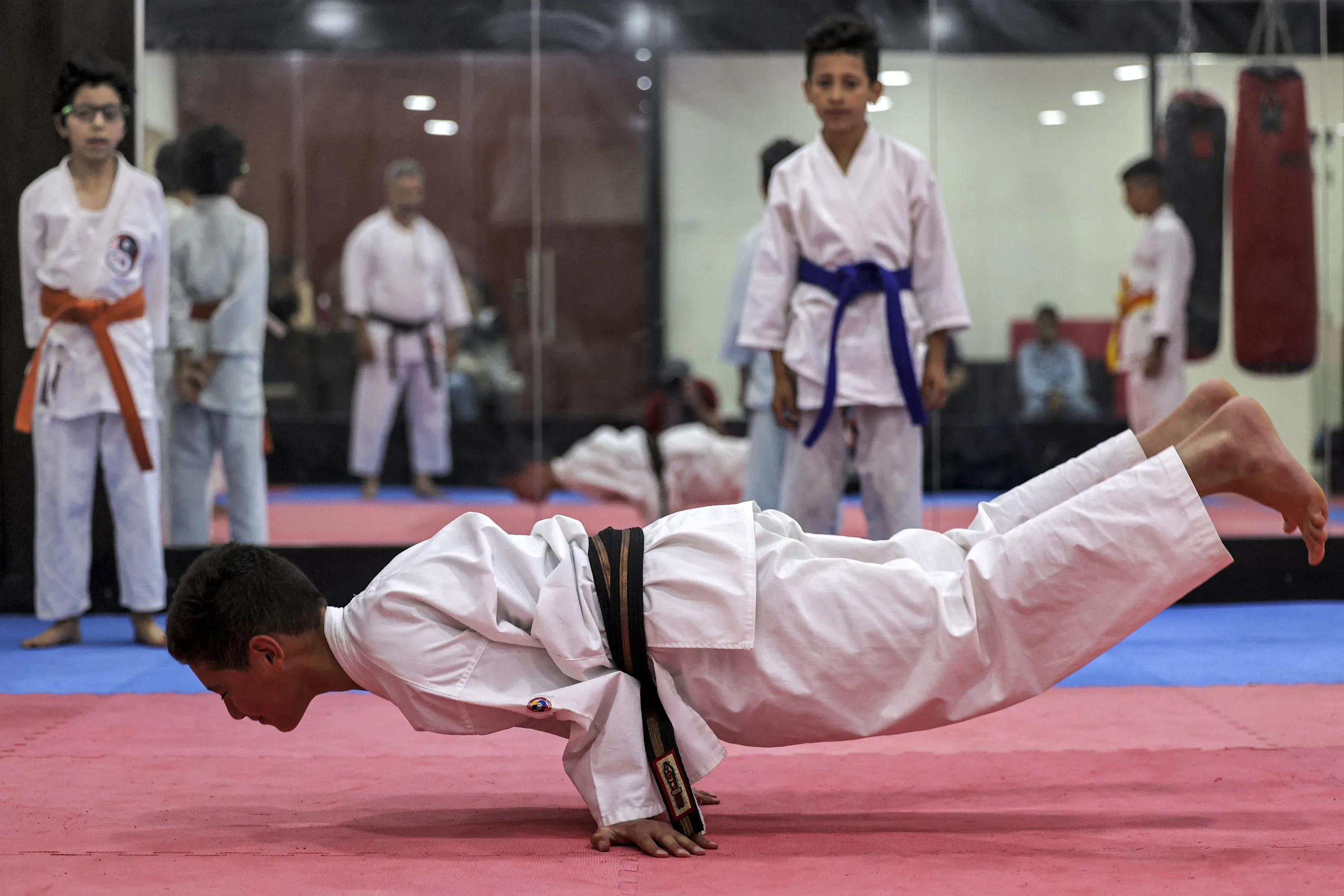 Palestinian karate students practice yoga at a dojo on the occasion of International Yoga Day in the city of Ramallah in the occupied West Bank on June 21, 2022. (Photo by Abbas Momani/AFP Photo)