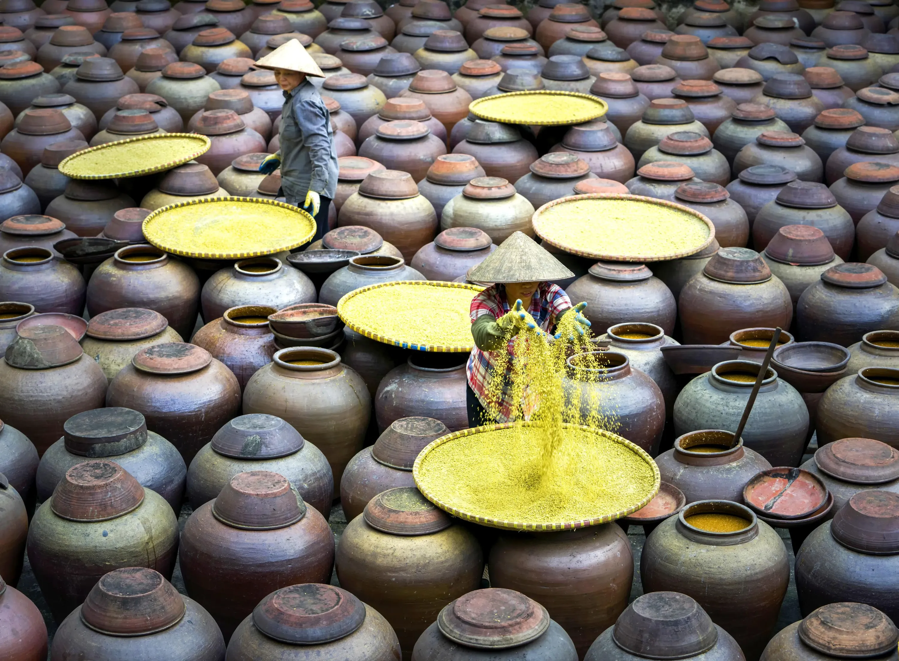 Workers examine pots of traditional Vietnamese sauce in Ho Chi Minh early July 2022. (Photo by Sarawut Intarob/Solent News)