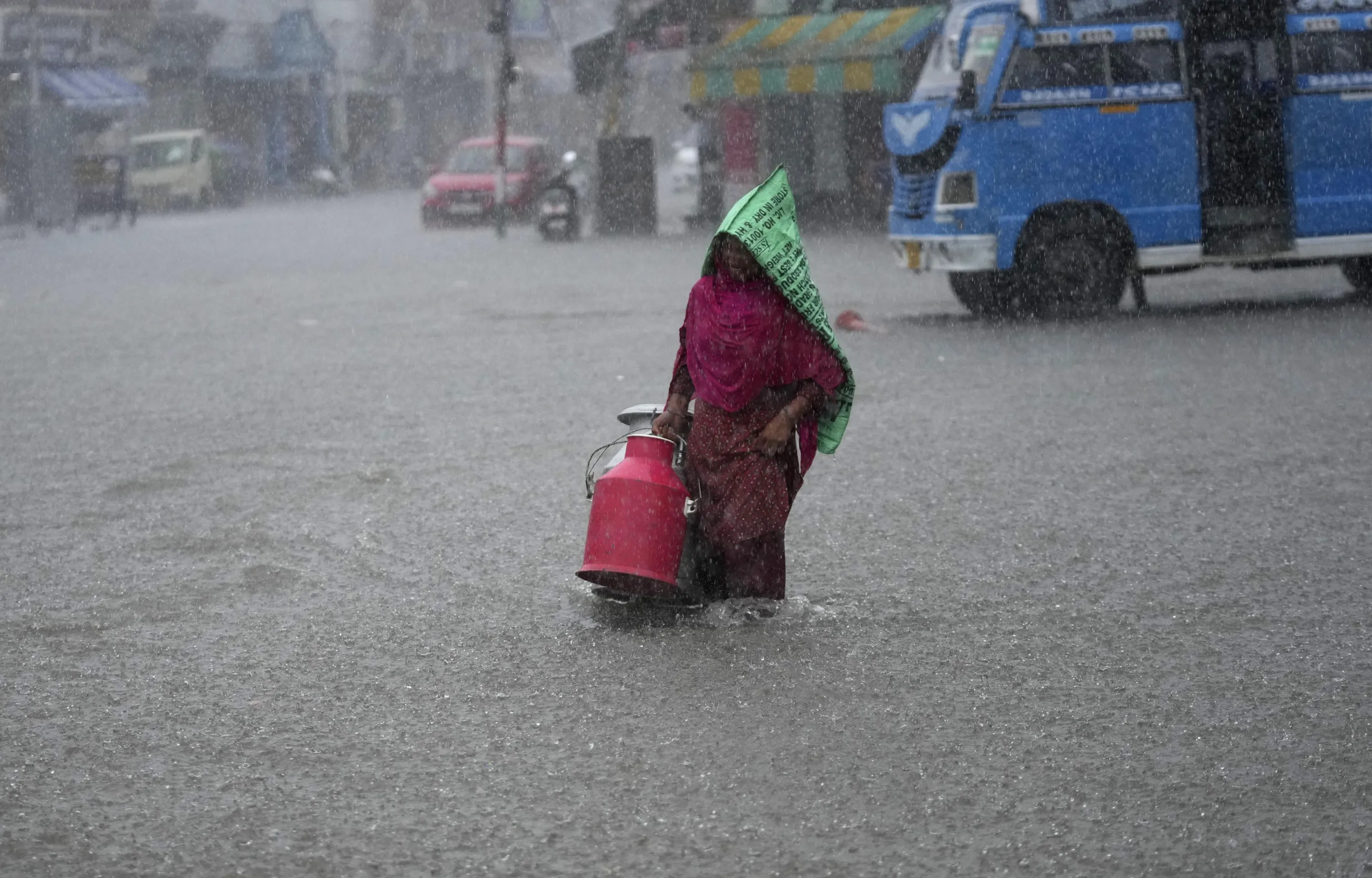 A woman wades through a waterlogged street during heavy rainfall in Jammu, India, Thursday, July 28, 2022. India's monsoon season runs from June to September. (Photo by Channi Anand/AP Photo)