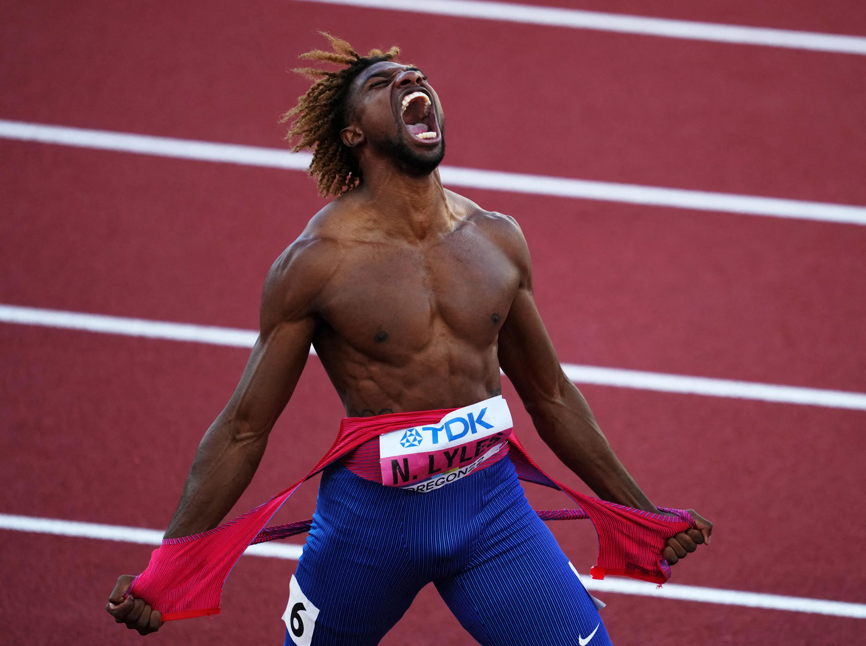 Noah Lyles of Team United States celebrates after winning gold in the Men's 200m Final during the eighteenth edition of the World Athletics Championships at Hayward Field in Eugene, Oregon. (Photo by Aleksandra Szmigiel/Reuters)