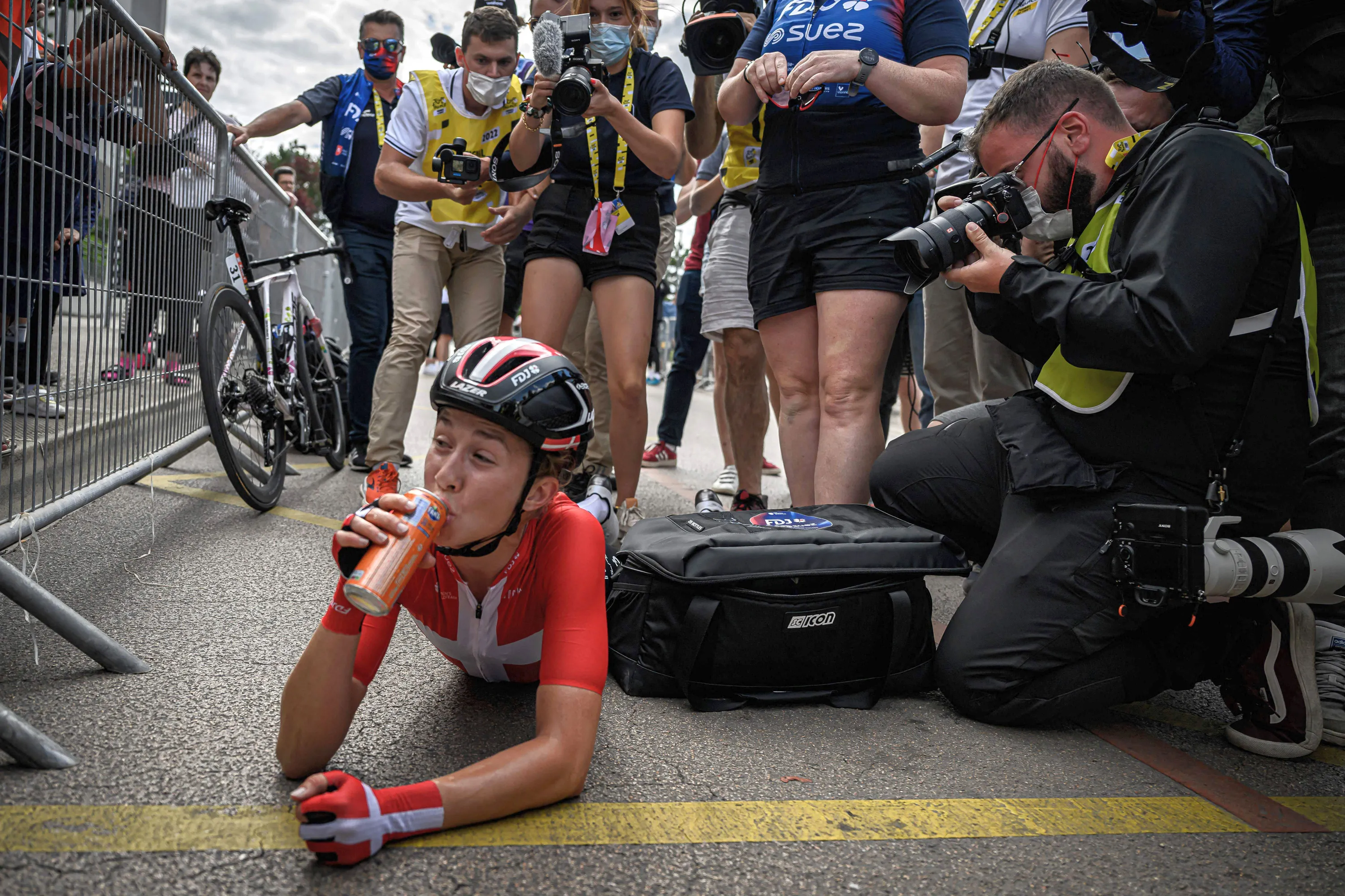 FDJ Suez Futuroscope's Danish rider Cecilie Ludwig celebrates after winning the 3rd stage of the new edition of the Women's Tour de France cycling race, a 133,6 km race between Reims and Epernay on July 26, 2022. (Photo by Jeff Pachoud/AFP Photo)