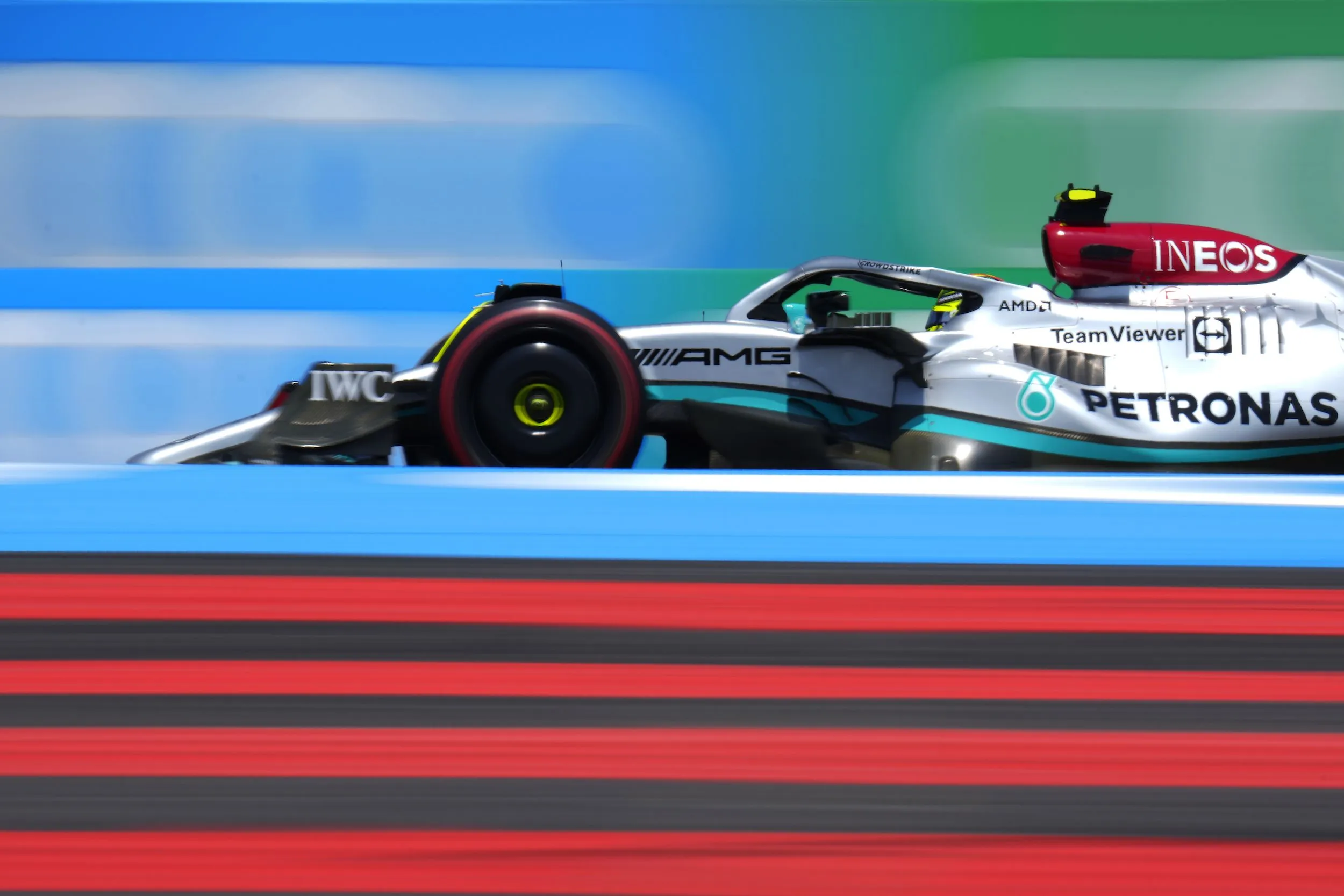 In this image taken with a slow shutter speed, Mercedes driver Lewis Hamilton of Britain steers his car during the third practice session for the French Formula One Grand Prix at Paul Ricard racetrack in Le Castellet, southern France, Saturday, July 23, 2022. The French Grand Prix will be held on Sunday. (Photo by Manu Fernandez/AP Photo)
