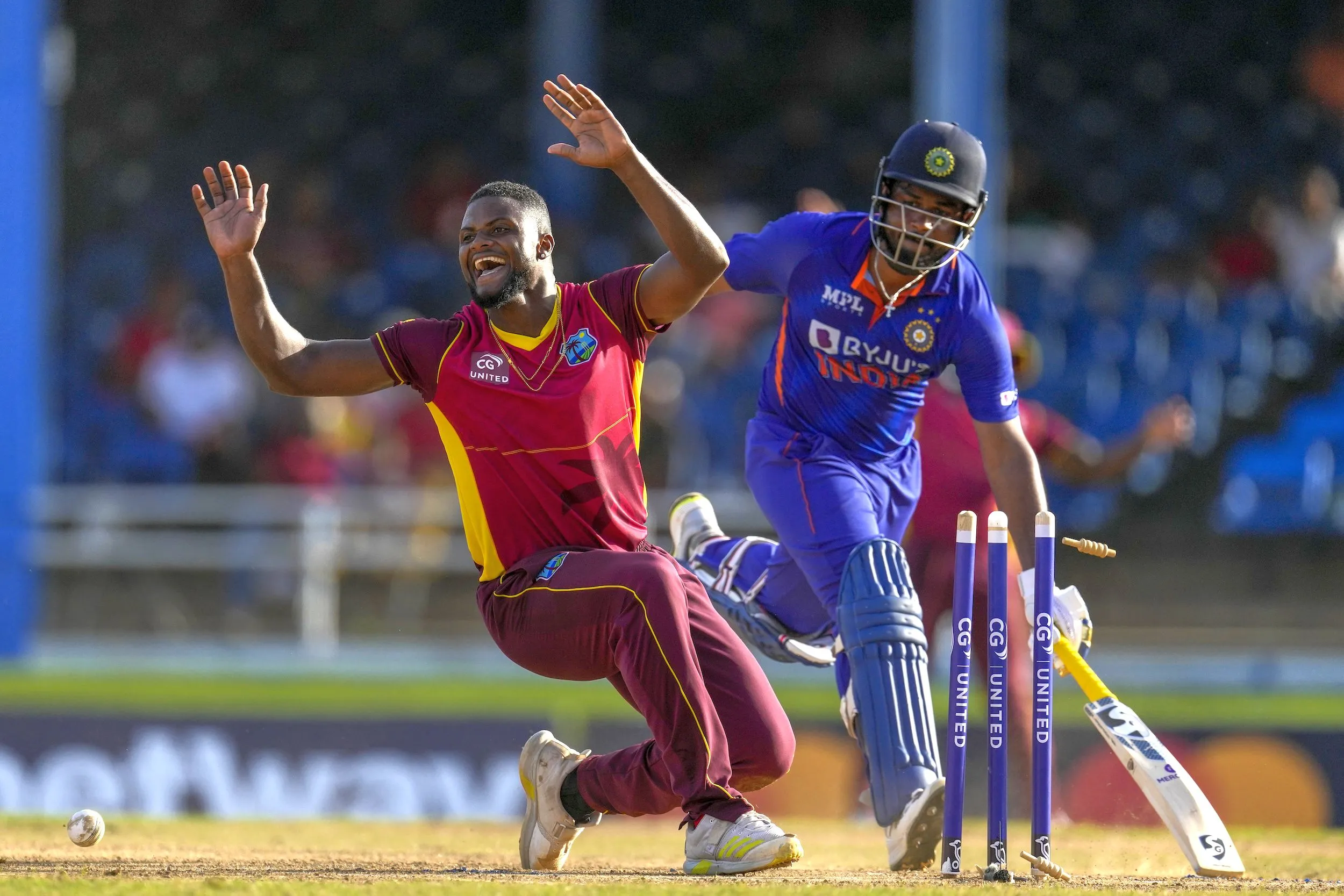 West Indies' Romario Shepherd celebrates dismissing India’s Sanju Samson during the second ODI cricket match at Queen's Park Oval in Port of Spain, Trinidad and Tobago, Sunday, July 24, 2022. (Photo by Ricardo Mazalan/AP Photo)
