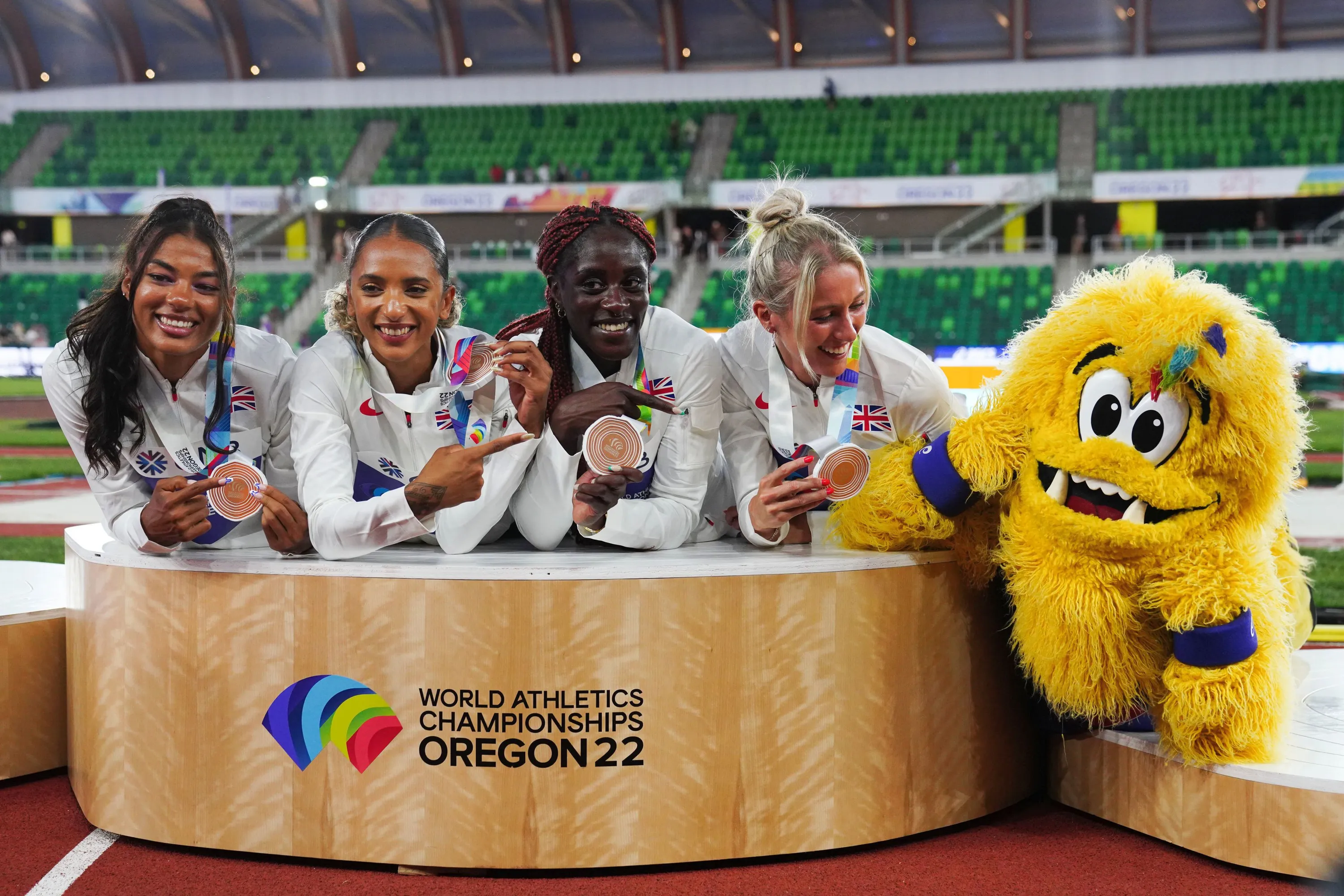 Great Britain's Laviai Nielsen, Jessie Knight, Victoria Ohuruogu and Nicole Yeargin following the Women's 4x400m Relay Final on day ten of the World Athletics Championships at Hayward Field, University of Oregon in the United States of America on Sunday, July 24, 2022. (Photo by Martin Rickett/PA Wire)