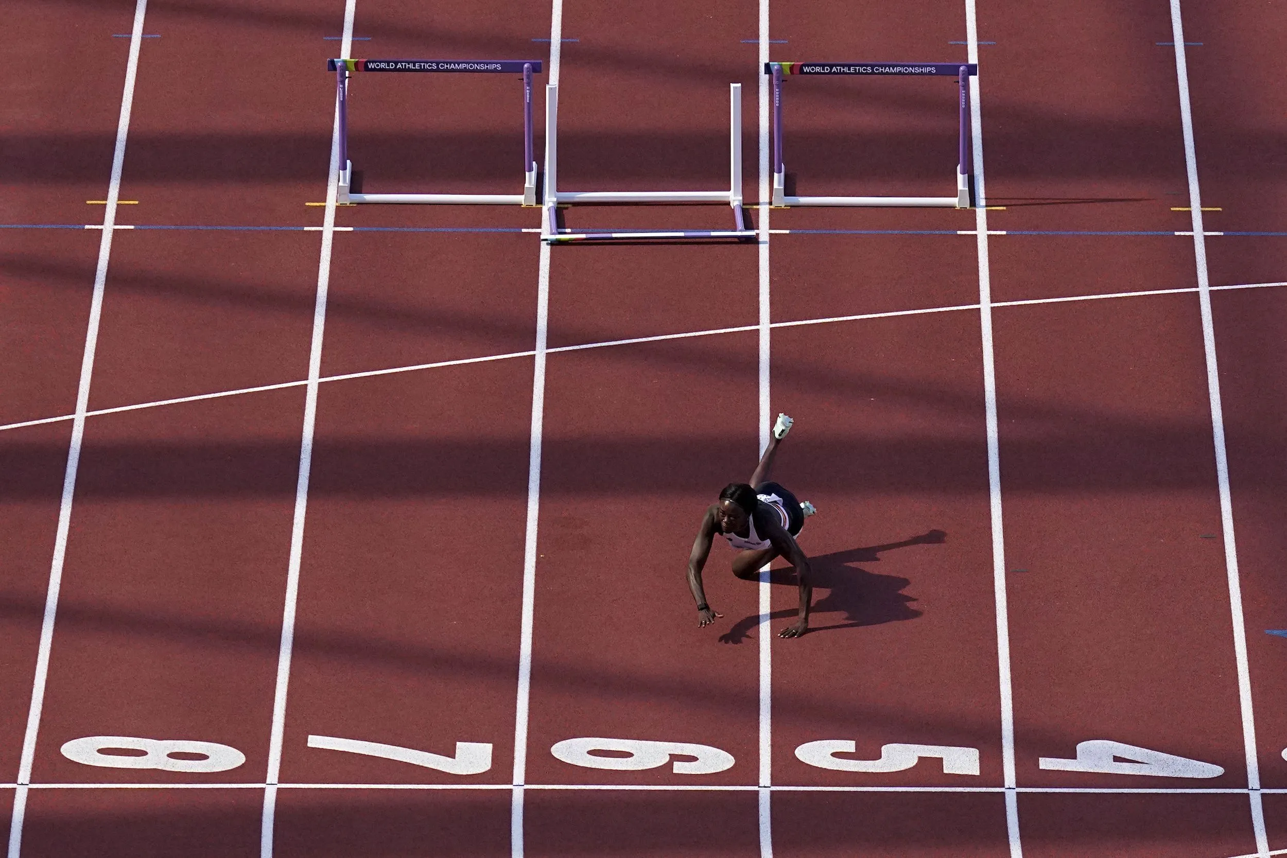 Anne Zagre, of Belgium, falls running alone in a heat in the women's 100-meter hurdles at the World Athletics Championships on Saturday, July 23, 2022, in Eugene, Ore. Zagre in lane six got hampered during the race at the 10th hurdle by Nia Ali, of the USA in lane five. Ali of the USA knocked a hurdle over and got in lane six, affecting Zagre. (Photo by Gregory Bull/AP Photo)
