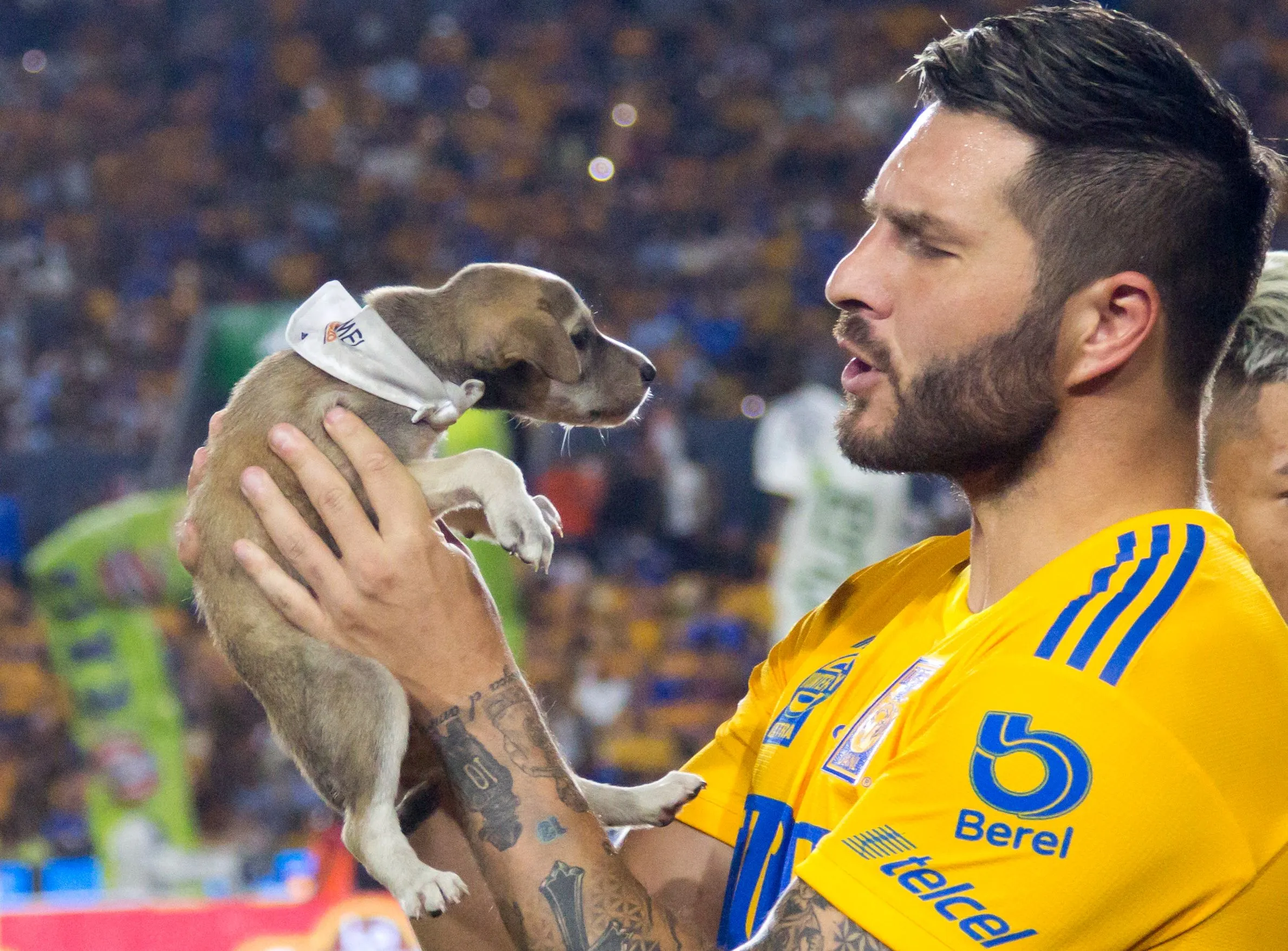 Andree Pierre-Gignac holds a puppy as part of the dog day celebration before the start the Mexican Clausura 2022 football tournament match against Atlas at the Universitario stadium in Monterrey, Mexico, on July 23, 2022. (Photo by Julio Cesar Aguilar/AFP Photo)