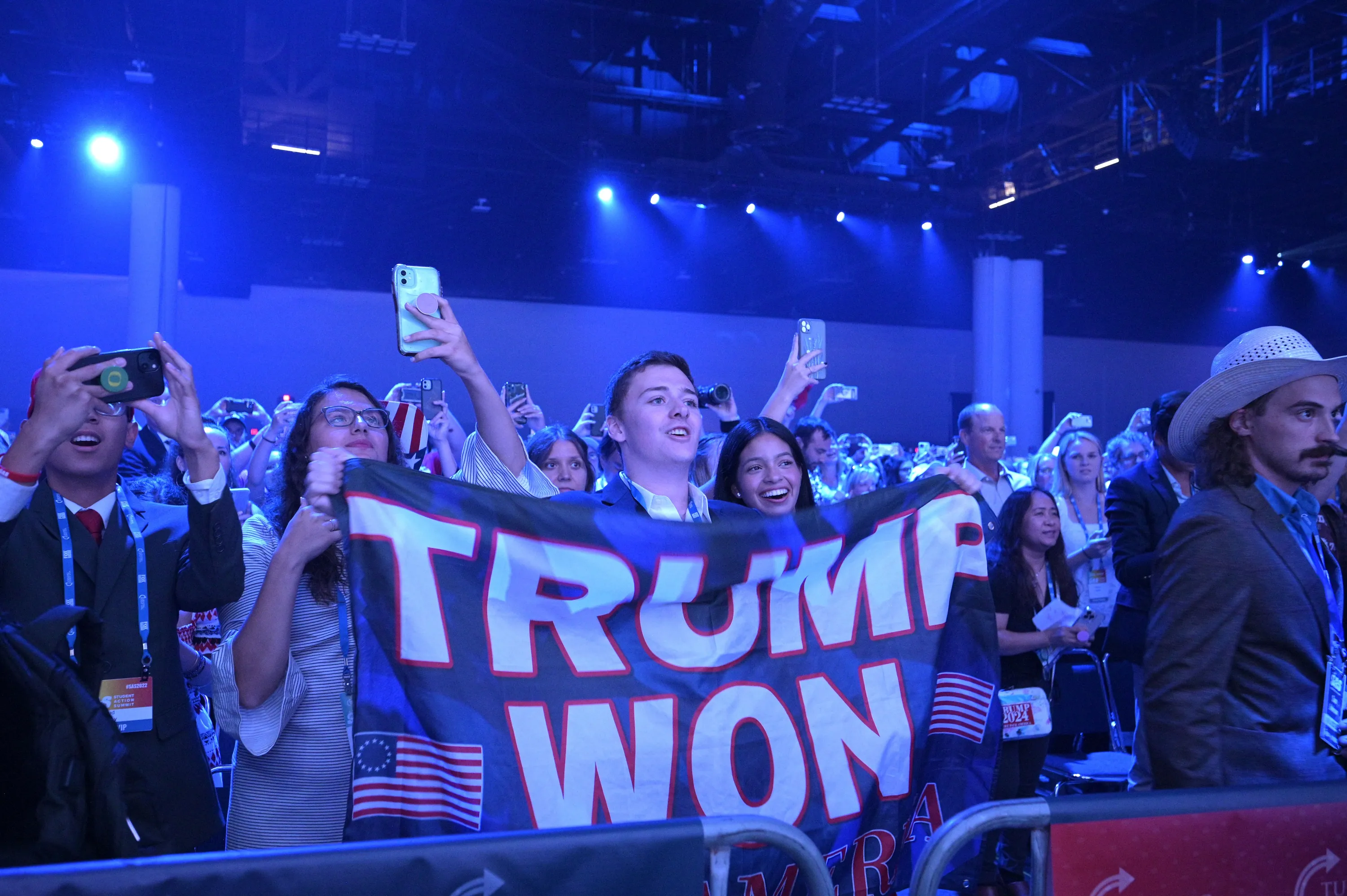Attendees display a flag as former President Donald Trump takes the stage during the Turning Point USA Student Action Summit, Saturday, July 23, 2022, in Tampa, Fla. (Photo by Phelan M. Ebenhack/AP Photo)