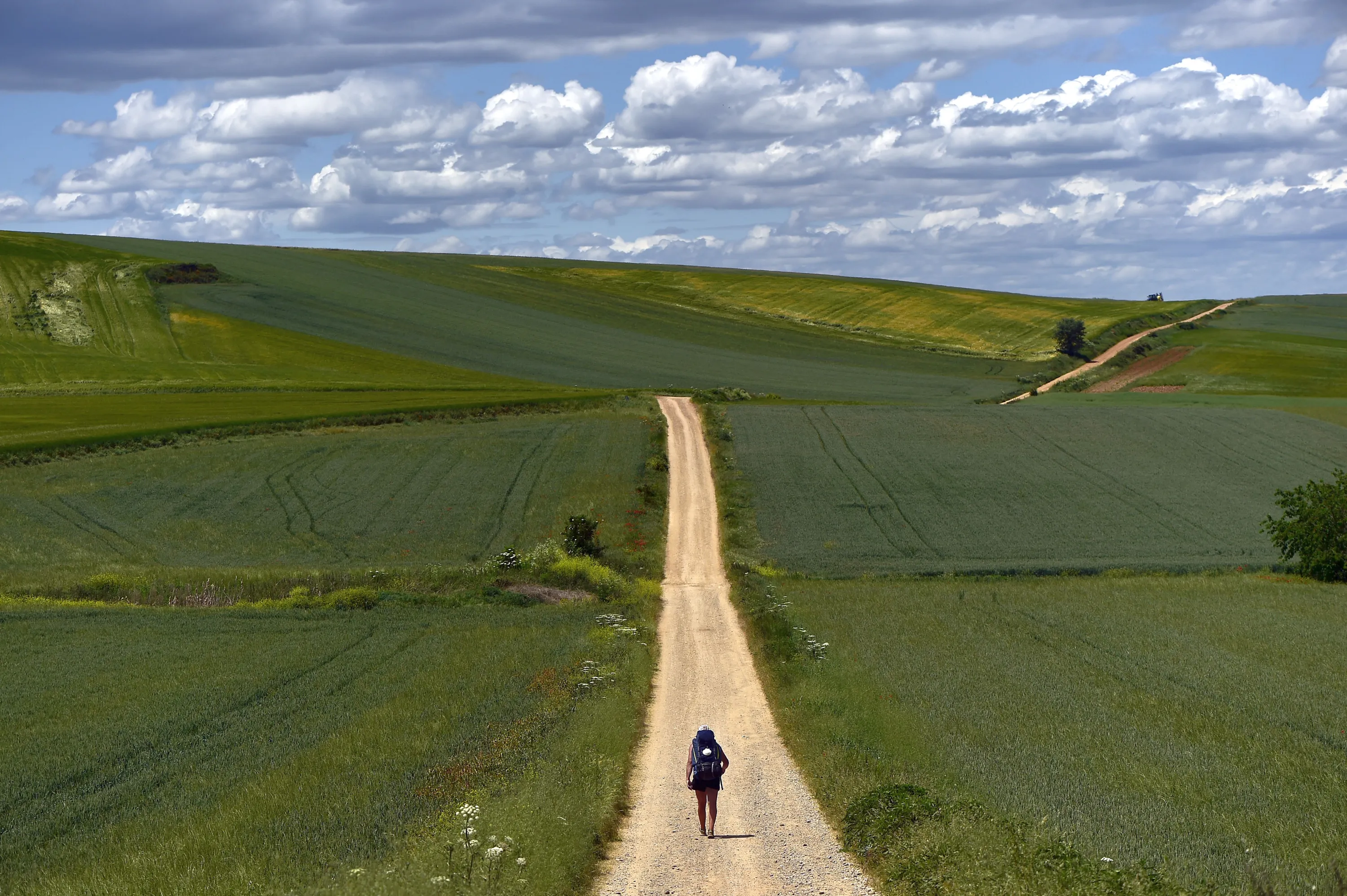 A pilgrim walks during a stage of “Camino de Santiago” or St. James Way near to Santo Domingo de La Calzada, northern Spain, Tuesday, May 31, 2022. Over centuries, villages with magnificent artwork were built along the Camino de Santiago, a 500-mile pilgrimage route crossing Spain. Today, Camino travelers are saving those towns from disappearing, rescuing the economy and vitality of hamlets that were steadily losing jobs and population. “The Camino is life”, say villagers along the route. (Photo by Alvaro Barrientos/AP Photo)