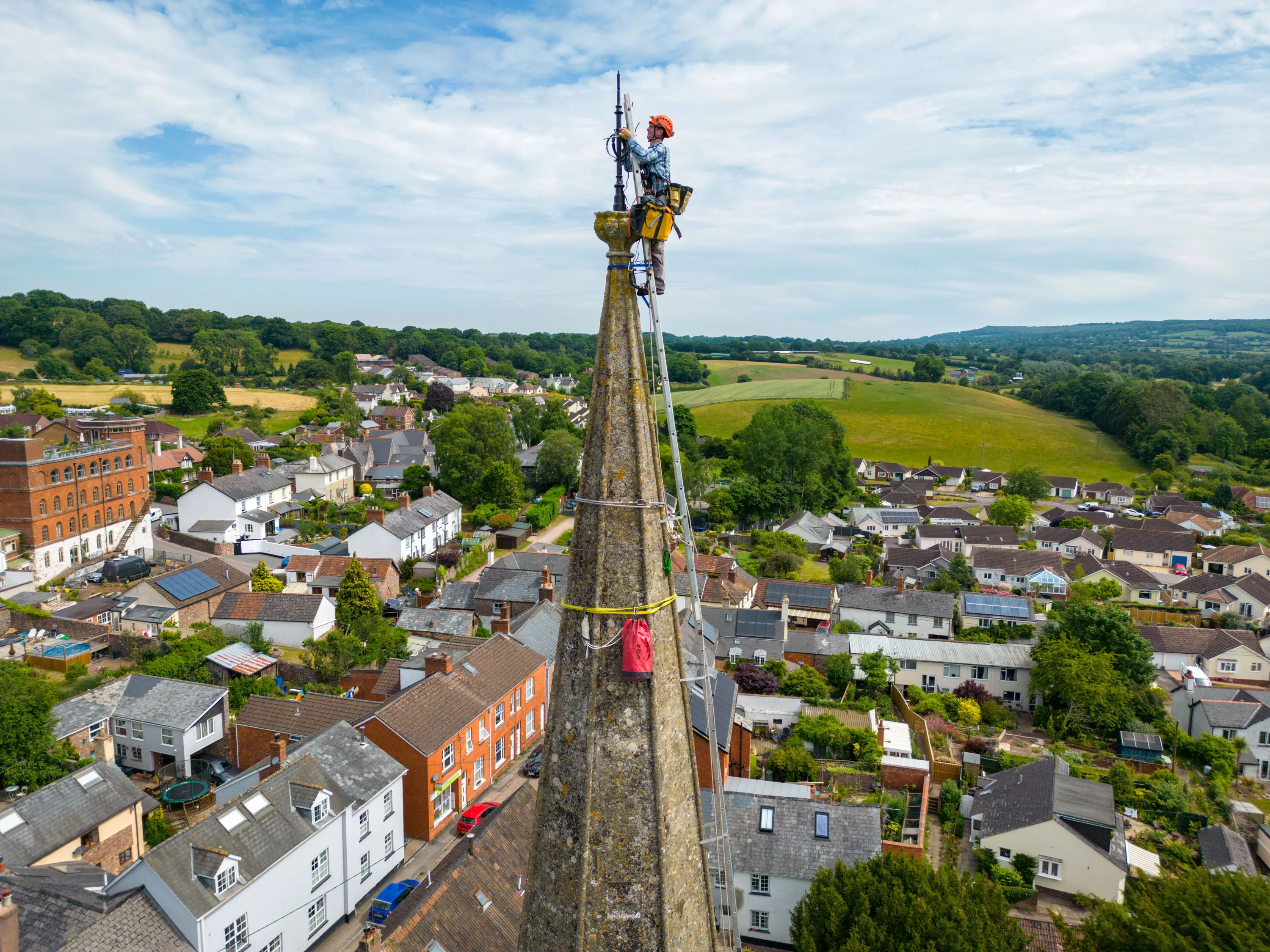 Arthur Needham from Vitruvius Building Conservation paints the lightning conductor on the steeple as part of restoration work at the top of St Mary’s Church, on June 23, 2022 in Uffculme, United Kingdom. (Photo by Finnbarr Webster/Getty Images)