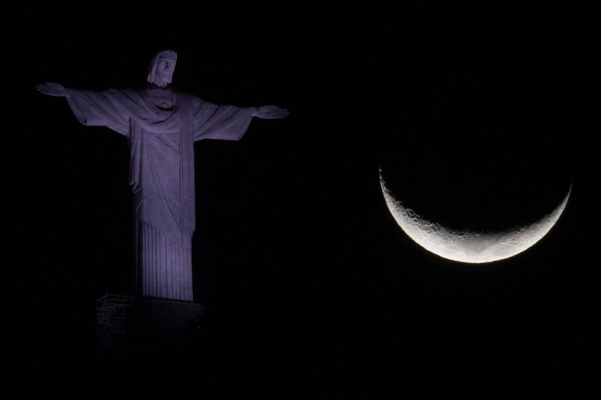 The crescent moon is seen next to the Christ The Redeemer statue in Rio de Janeiro, Brazil, on August 1, 2022. (Photo by Mauro Pimentel/AFP Photo)