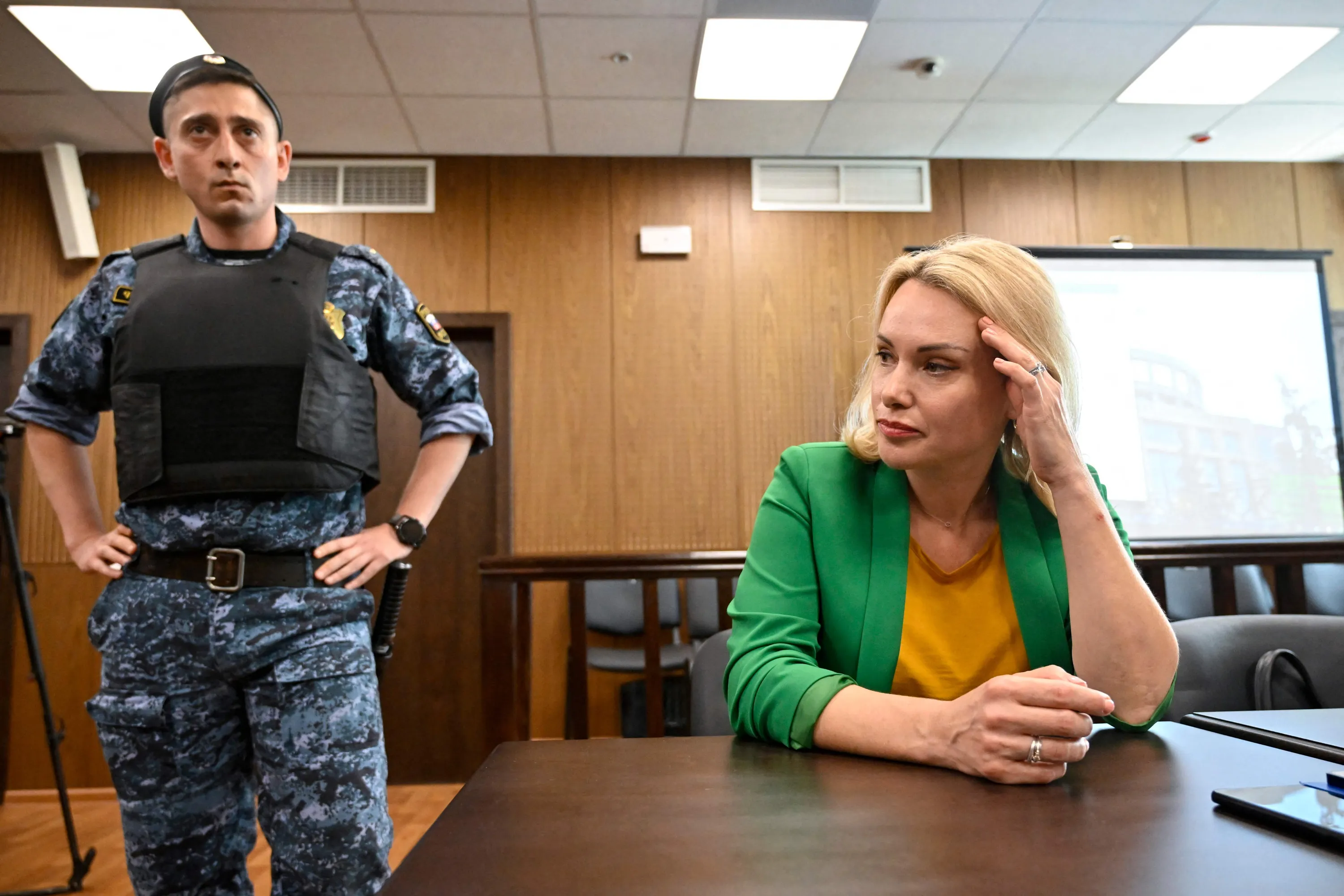 Marina Ovsyannikova, the journalist who became known internationally after protesting against the Russian military action in Ukraine during a prime-time news broadcast on state television, appears in court accused of “discrediting” the Russian army fighting in Ukraine over her remarks outside a Moscow court earlier this month in support of opposition activist Ilya Yashin, in Moscow on July 28, 2022. (Photo by Alexander Nemenov/AFP Photo)
