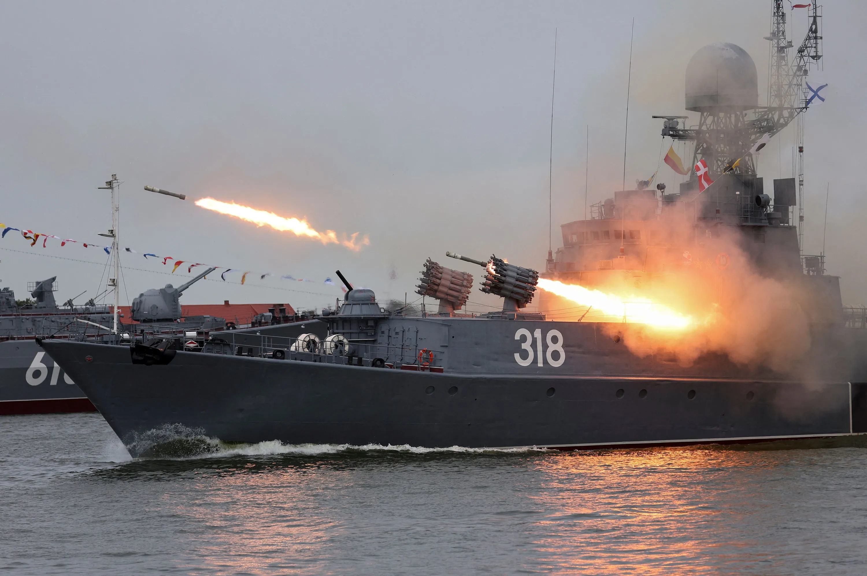 The Russian corvette Aleksin fires missiles during a parade marking Navy Day in Baltiysk in the Kaliningrad region, Russia on July 31, 2022. (Photo by Vitaly Nevar/Reuters)