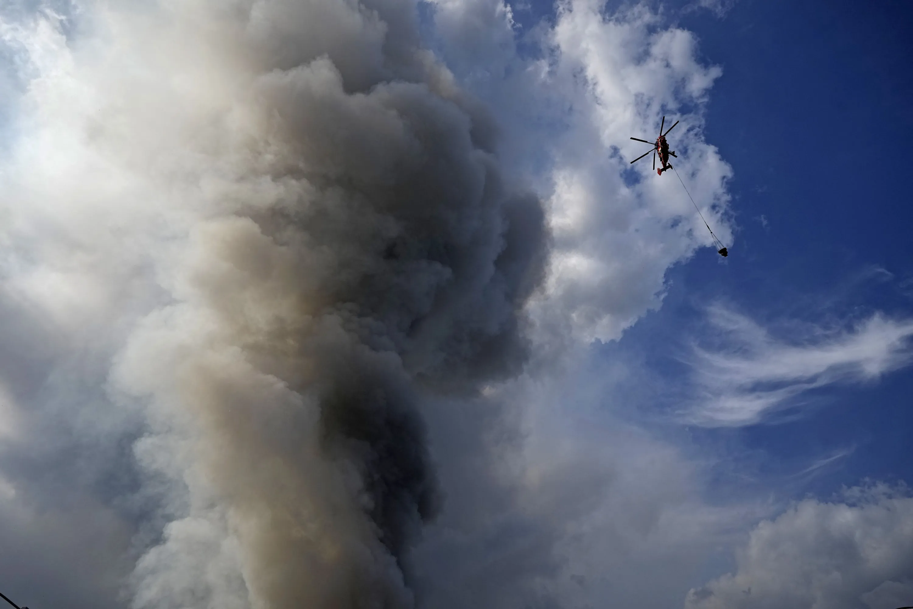 A helicopter extinguishes a fire at a warehouse of the online retailer Ozon in Istra Municipal District, northwest Moscow Region, Russia, Wednesday, August 3, 2022. (Photo by Alexander Zemlianichenko/AP Photo)