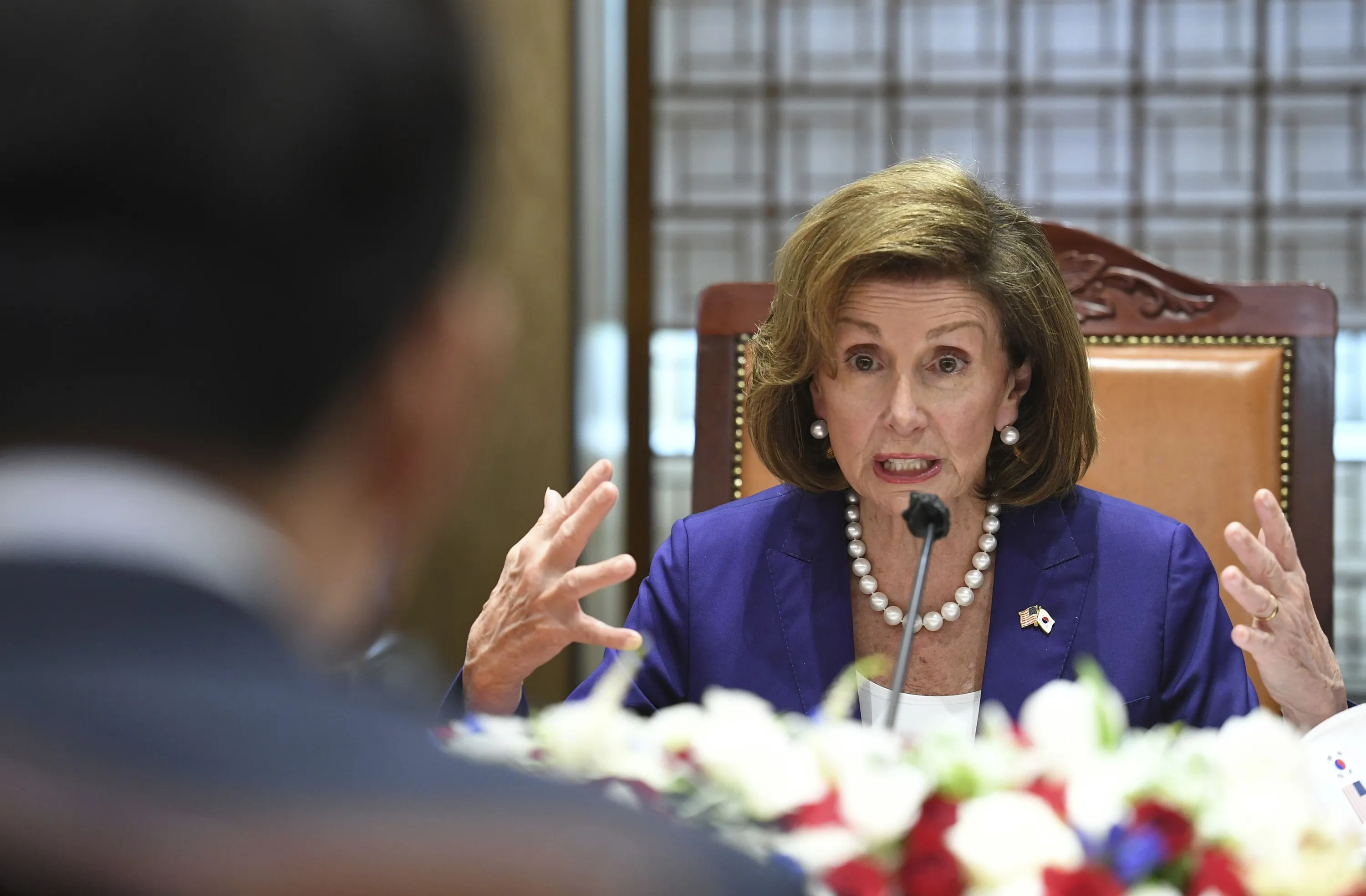 U.S. House Speaker Nancy Pelosi talks with South Korean National Assembly Speaker Kim Jin Pyo during their meeting at the National Assembly in Seoul, South Korea Thursday, August 4, 2022. (Photo by Kim Min-Hee/Pool Photo via AP Photo)