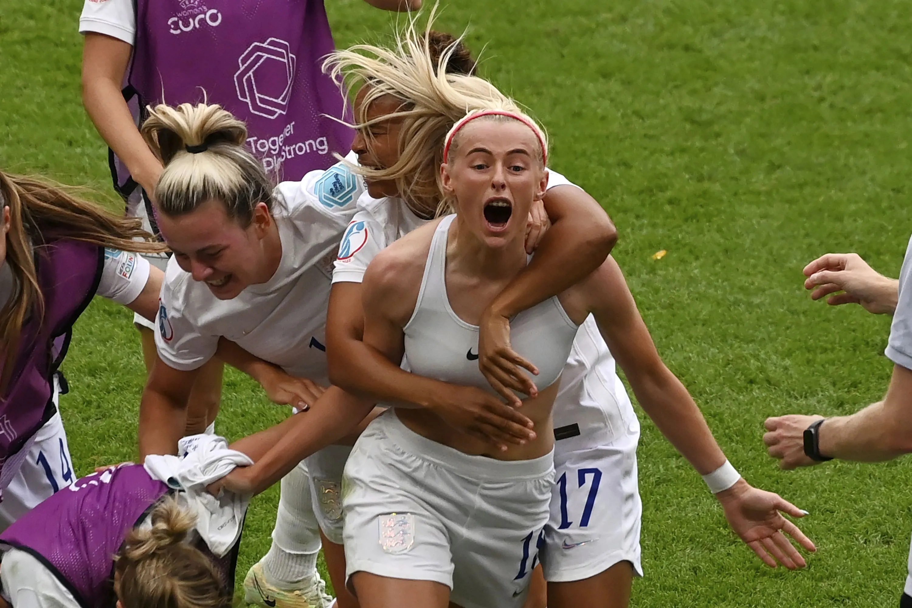 England's Chloe Kelly, centre, celebrates with teammates after scoring her side's second goal during the Women's Euro 2022 final soccer match between England and Germany at Wembley stadium in London, Sunday, July 31, 2022. (Photo by Rui Vieira/AP Photo)