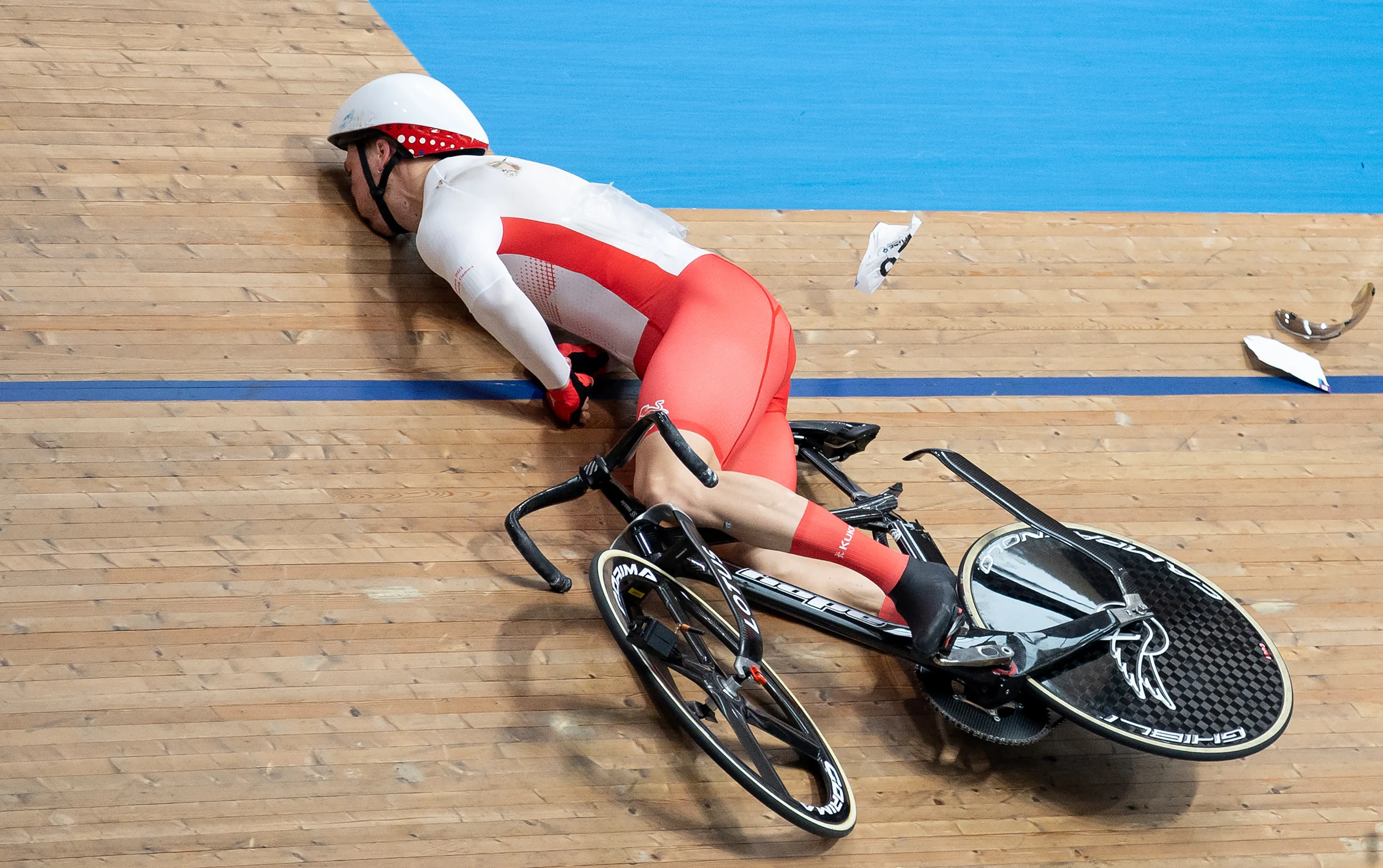 Joe Truman of Team England crashes during the Men's Track Cycling Keirin Second Round Heat One on day two of the Birmingham 2022 Commonwealth Games at Lee Valley Velopark Velodrome on July 30, 2022 on the London, England. (Photo by Justin Setterfield/Getty Images)