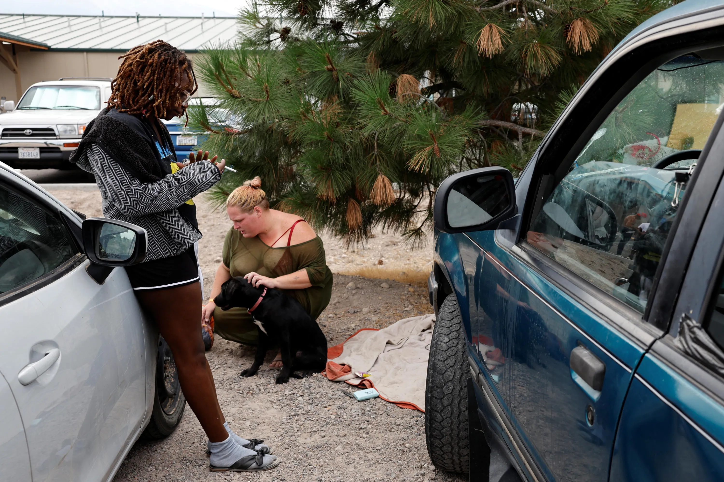 Paisley Bamberg, Kylie Hughes and their dog Selenith from Yreka, who have evacuated the area amidst the fast-moving McKinney Fire, stand near some cars outside an evacuation shelter in Weed, California, U.S. July 31, 2022. (Photo by Fred Greaves/Reuters)