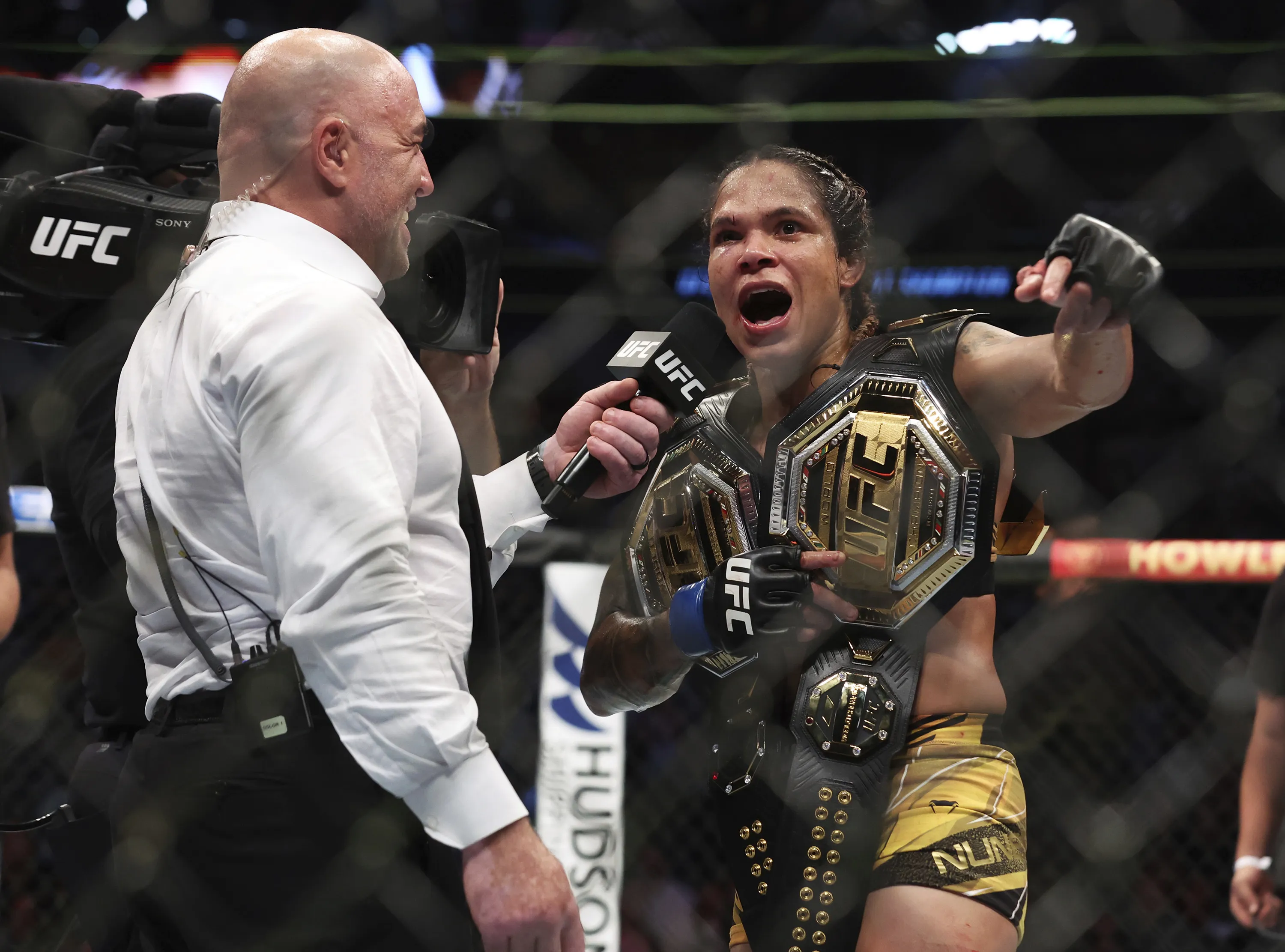 Joe Rogan interviews Amanda Nunes after her victory over Julianna Pena in a mixed martial arts women's bantamweight title bout at UFC 277 on Saturday, July 30, 2022, in Dallas. (Photo by Richard W. Rodriguez/AP Photo)