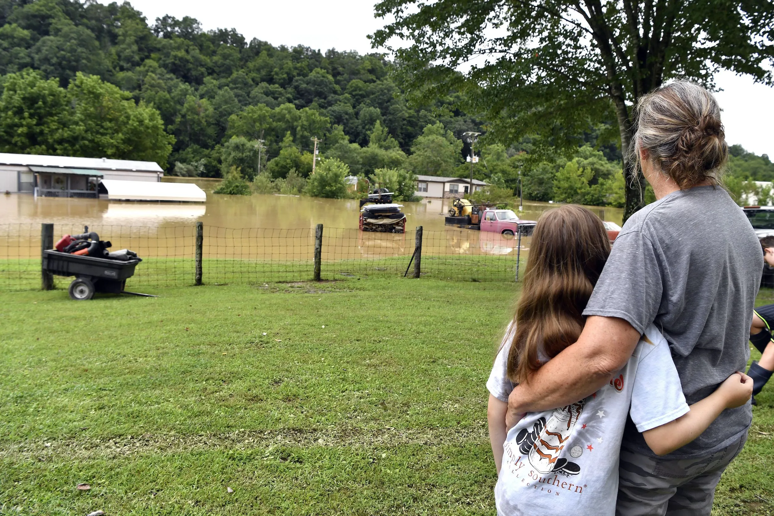 Bonnie Combs, right, hugs her 10-year-old granddaughter Adelynn Bowling watches as her property becomes covered by the North Fork of the Kentucky River in Jackson, Ky., Thursday, July 28, 2022. Flash flooding and mudslides were reported across the mountainous region of eastern Kentucky. (Photo by Timothy D. Easley/AP Photo)