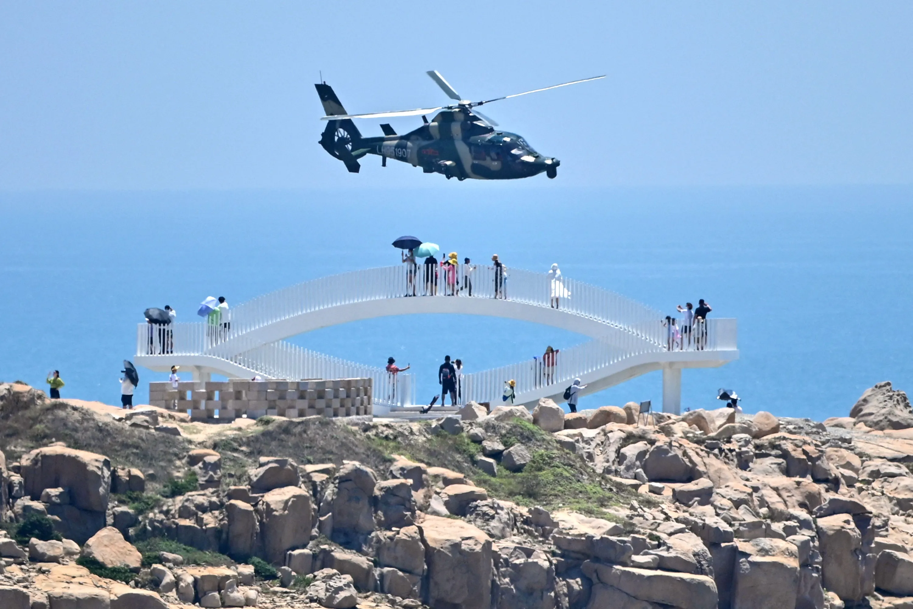 Tourists look on as a Chinese military helicopter flies past Pingtan island, one of mainland China's closest point from Taiwan, in Fujian province on August 4, 2022, ahead of massive military drills off Taiwan following US House Speaker Nancy Pelosi's visit to the self-ruled island. China is due on August 4 to kick off its largest-ever military exercises encircling Taiwan, in a show of force straddling vital international shipping lanes following a visit to the self-ruled island by US House Speaker Nancy Pelosi. (Photo by Hector Retamal/AFP Photo)