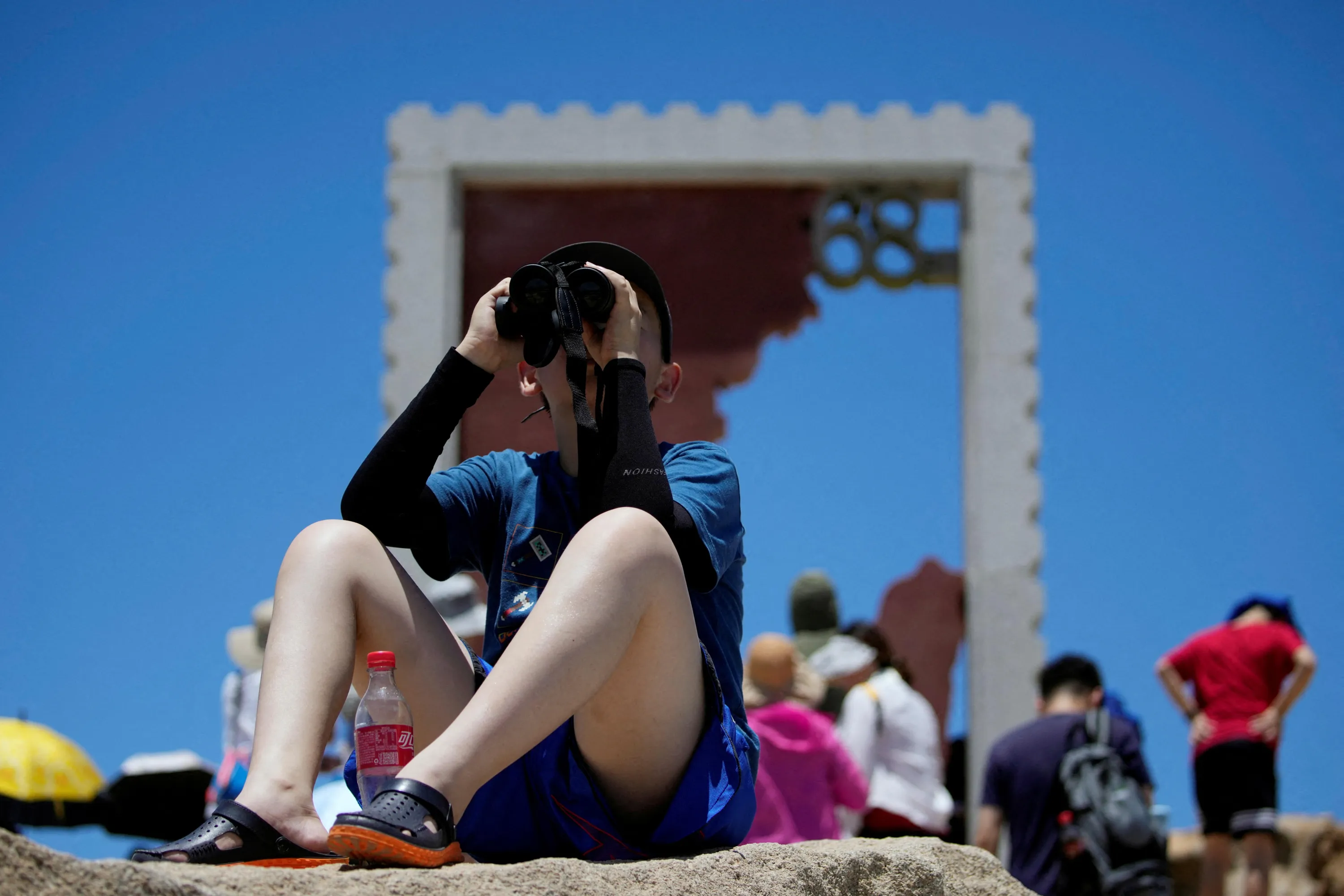 A boy holds binoculars at the 68-nautical-mile scenic spot, one of mainland China's closest points to the island of Taiwan, in Pingtan island, Fujian province, China on August 5, 2022. (Photo by Aly Song/Reuters)