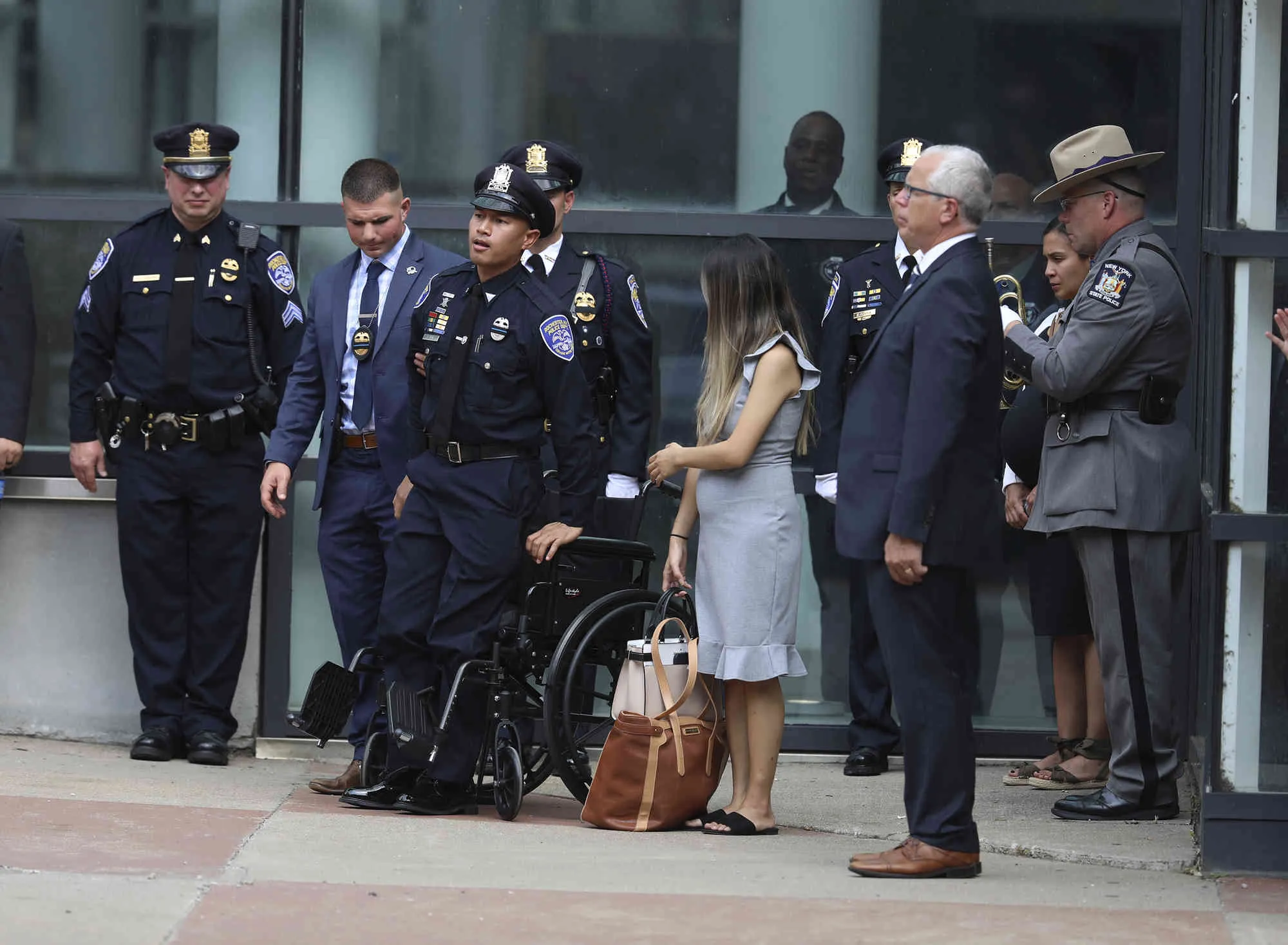 Rochester Police Officer Sino Seng stands up from his wheelchair so he can stand at attention as the cemetery procession lines up after the funeral for his partner, Officer Anthony Mazurkiewicz, at Blue Cross Arena in Rochester, NY., Monday, August 1, 2022. Seng was injured and Mazurkiewicz was killed in an ambush as they investigated a murder on July 21. (Photo by Tina MacIntyre-Yee/Democrat & Chronicle via AP Photo)