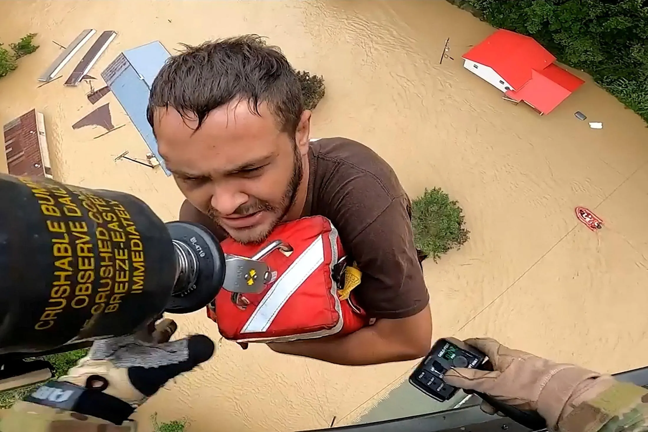 A man is rescued from flooding by the crew of a U.S. Army National Guard Blackhawk helicopter in eastern Kentucky, July 28-29 2022. (Photo by Staff Sgt. Shaun Morris/U.S. Army National Guard)