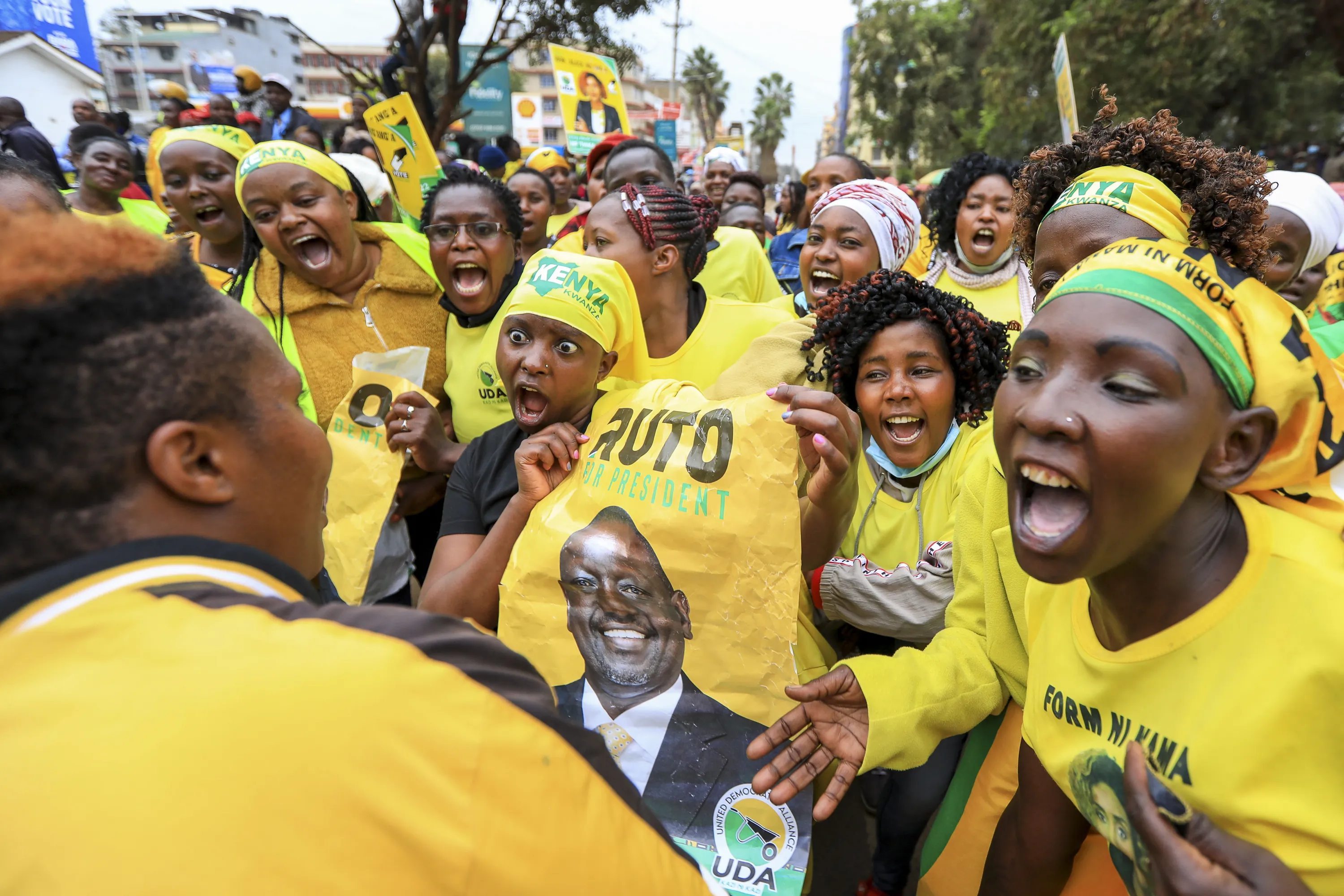 Supporters of the Kenya Kwanza Coalition shout slogans at the venue of a political rally attended by the coalition’s presidential candidate and Kenya's Deputy President William Ruto at Thika town, in Kiambu, Kenya, on 03 August 2022. Kenyan politicians continue to gear-up their political rallies as Kenya heads to its general elections on 09 August 2022. (Photo by Daniel Irungu/EPA/EFE)
