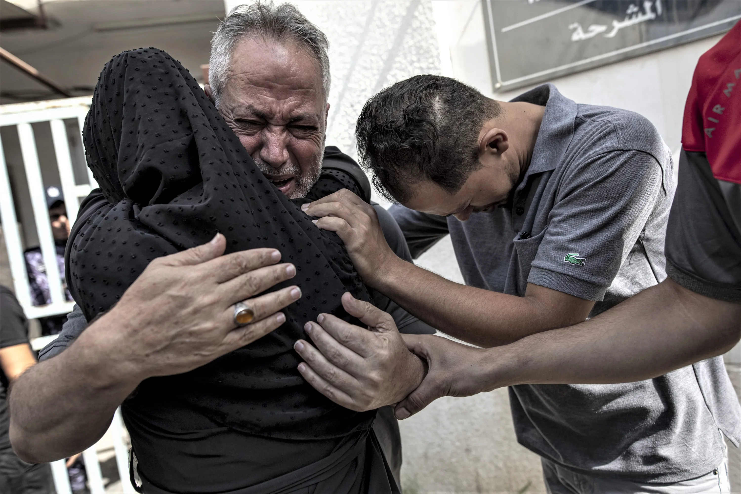 Relatives of Muhammad Hassouna, who was killed in an Israeli airstrike mourn before his funeral outside a hospital in Rafah, in the southern Gaza Strip, Sunday, August 7, 2022. An Israeli airstrike in Rafah killed a senior commander in the Palestinian militant group Islamic Jihad, authorities said Sunday, its second leader to be slain amid an escalating cross-border conflict. (Photo by Fatima Shbair/AP Photo)