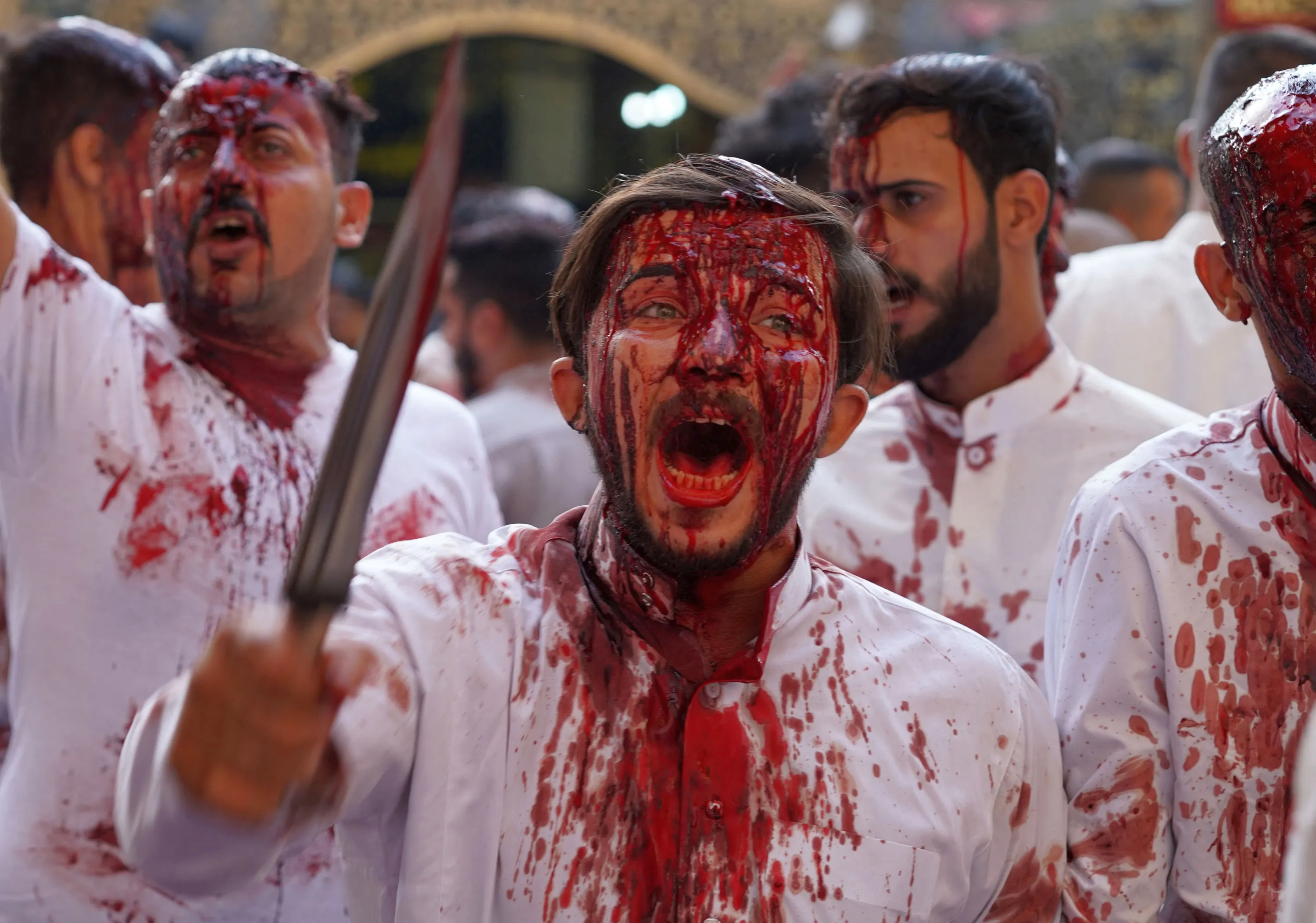 Shiite Muslims take part in the “Tatbir” bloodletting ritual as an act of mourning marking Ashura, a 10-day period commemorating the seventh century killing of Prophet Mohammed's grandson Imam Hussein, in Iraq's central holy city of Najaf, early on August 9, 2022. (Photo by Ali Najafi/AFP Photo)