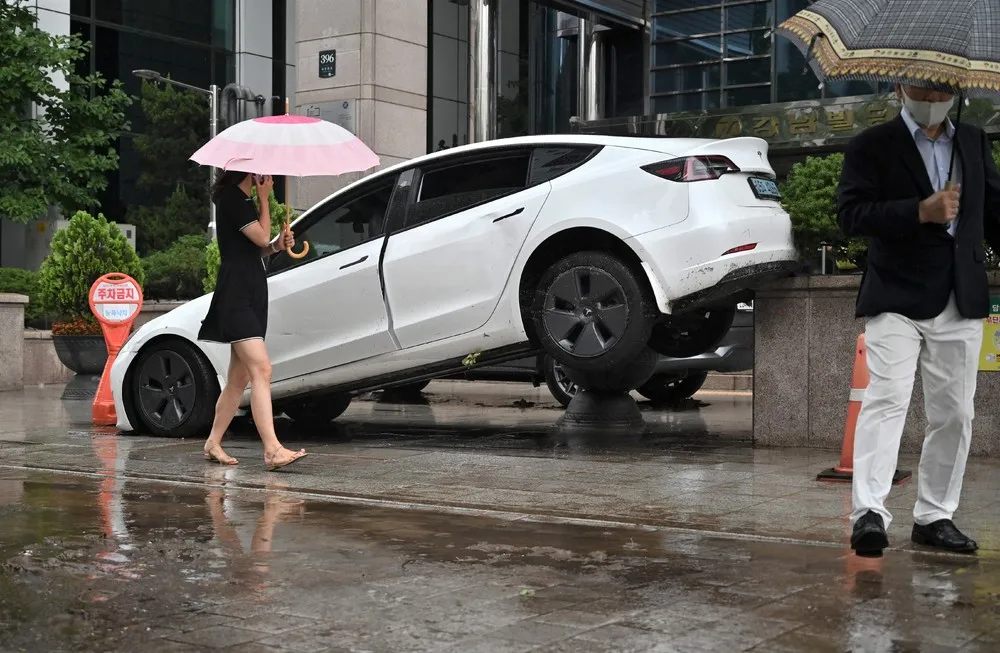 A car damaged by flood water is seen on the street after heavy rainfall at Gangnam district in Seoul on August 9, 2022. (Photo by Jung Yeon-je/AFP Photo)