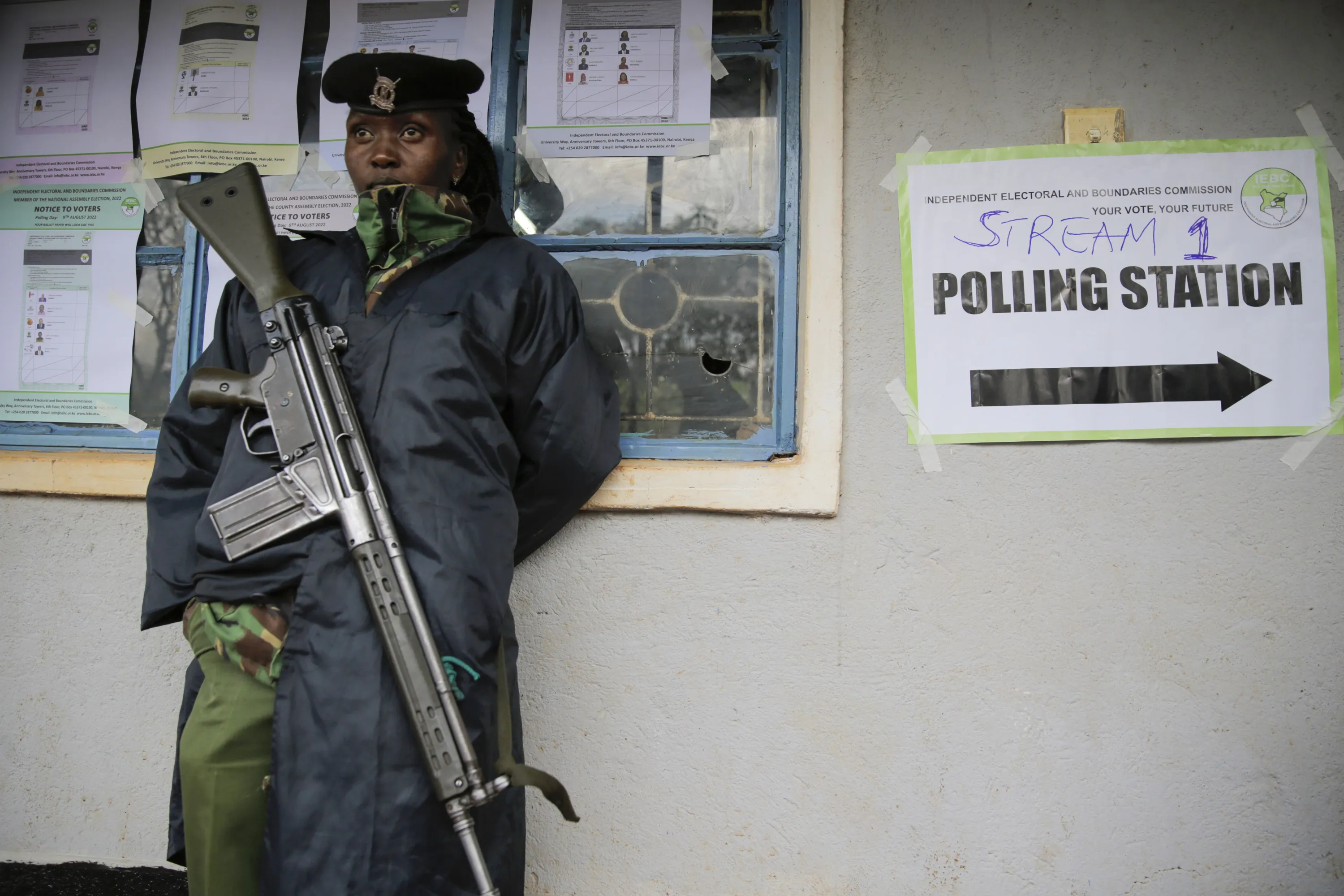 A Kenyan officer stands guard at a polling station in Sugoi, 50 kms (35 miles) north west of Eldoret, Kenya, Tuesday August 9, 2022. Kenyans are voting to choose between opposition leader Raila Odinga Deputy President William Ruto to succeed President Uhuru Kenyatta after a decade in power. (Photo by Brian Inganga/AP Photo)