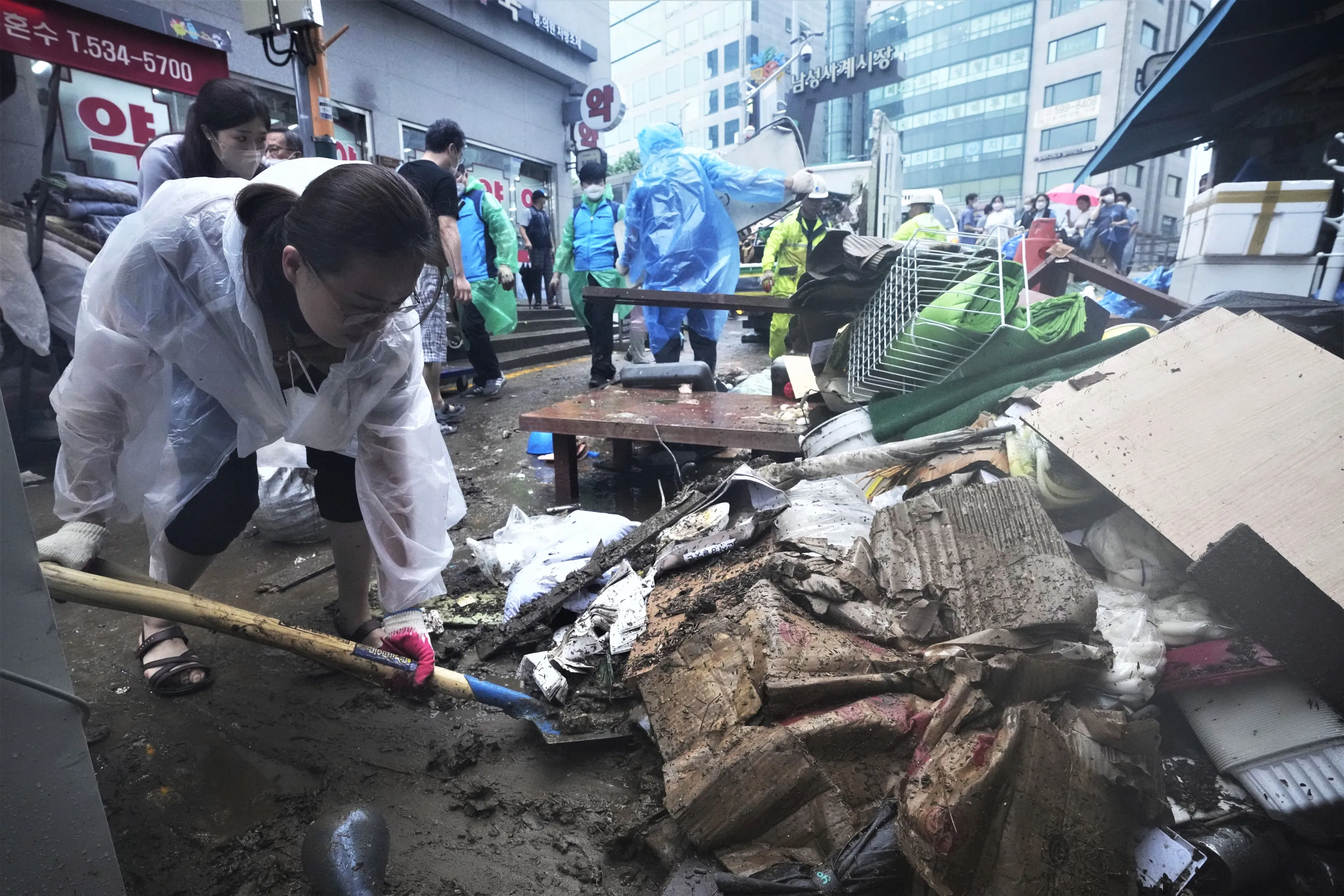 A woman cleans up debris after the water drained from a submerged traditional market following heavy rainfall in Seoul, South Korea, Tuesday, August 9, 2022. Heavy rains drenched South Korea's capital region, turning the streets of Seoul's affluent Gangnam district into a river, leaving submerged vehicles and overwhelming public transport systems. (Photo by Ahn Young-joon/AP Photo)