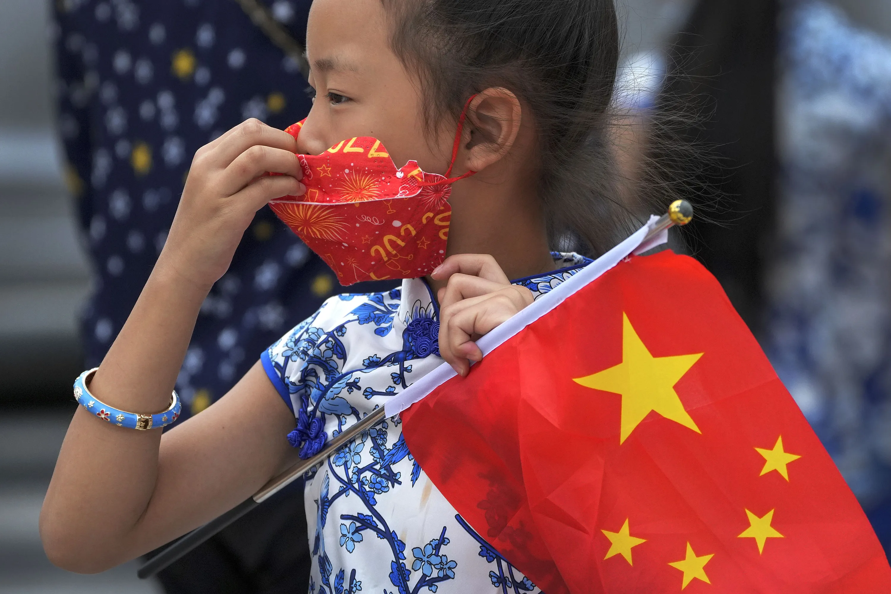 A child holds a national flag while adjusting her face mask on a street in Beijing, Tuesday, August 9, 2022. Chinese authorities have closed Tibet's famed Potala Palace after a minor outbreak of COVID-19 was reported in the Himalayan region. (Photo by Andy Wong/AP Photo)
