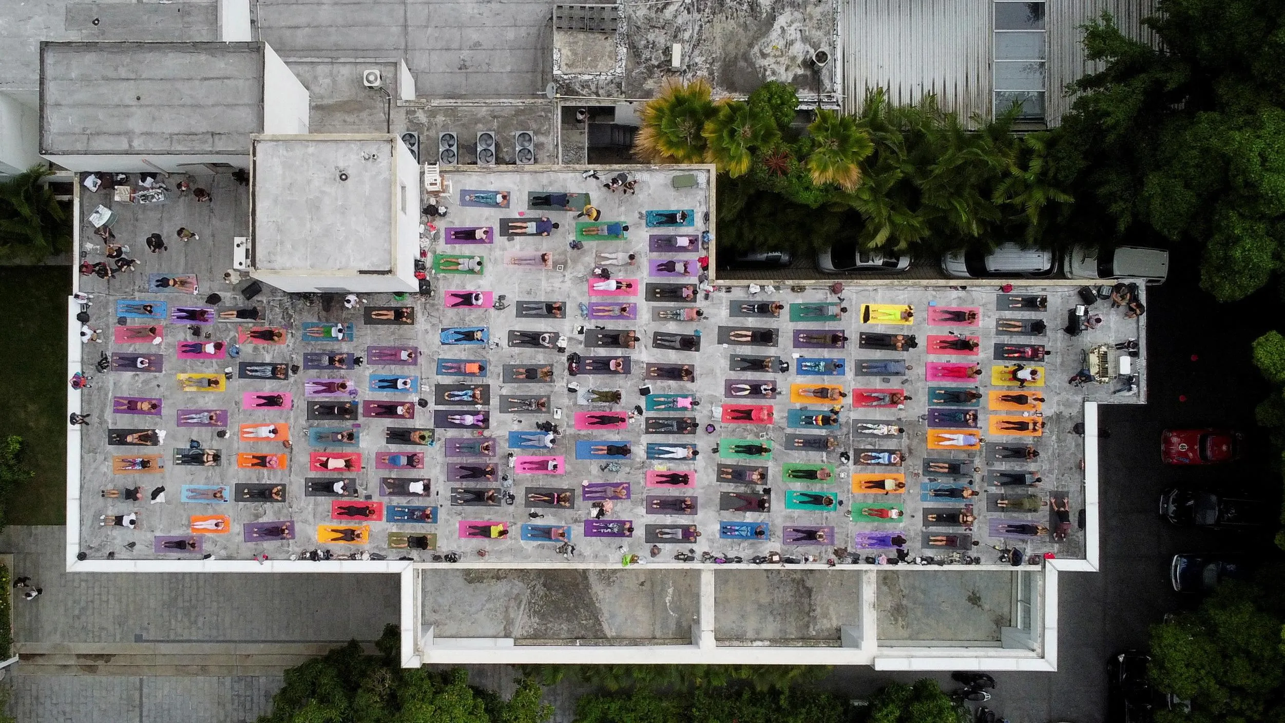 People participate in a yoga class on the roof of a building to celebrate the summer solstice, on International Yoga Day, in Caracas, Venezuela on June 21, 2022. Picture taken with drone. (Photo by Leonardo Fernandez Viloria/Reuters)