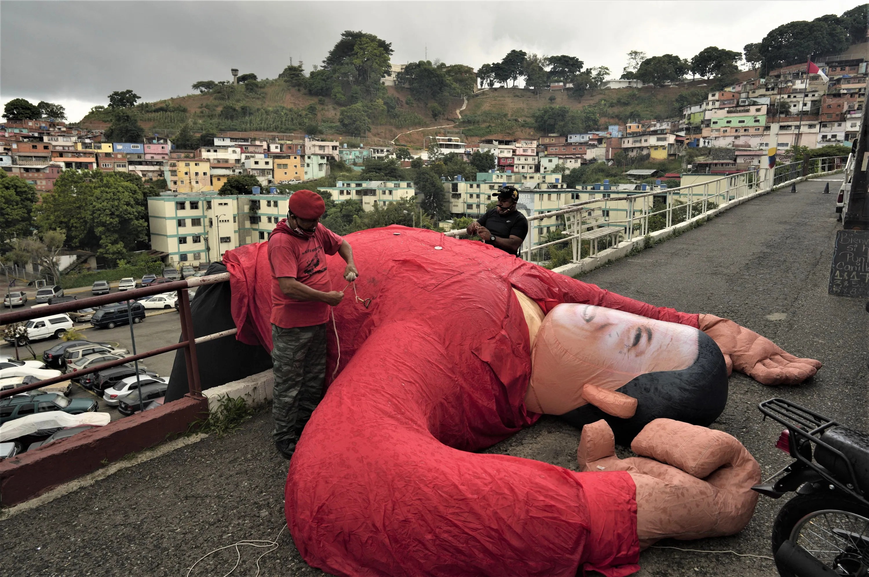 Supporters of Venezuela's late President Hugo Chavez bring down an inflatable doll of Chavez during a commemoration of what would have been the leader's 68th birthday, at the 23 de Enero neighborhood in Caracas, Venezuela, Thursday, July 28, 2022. (Photo by Ariana Cubillos/AP Photo)