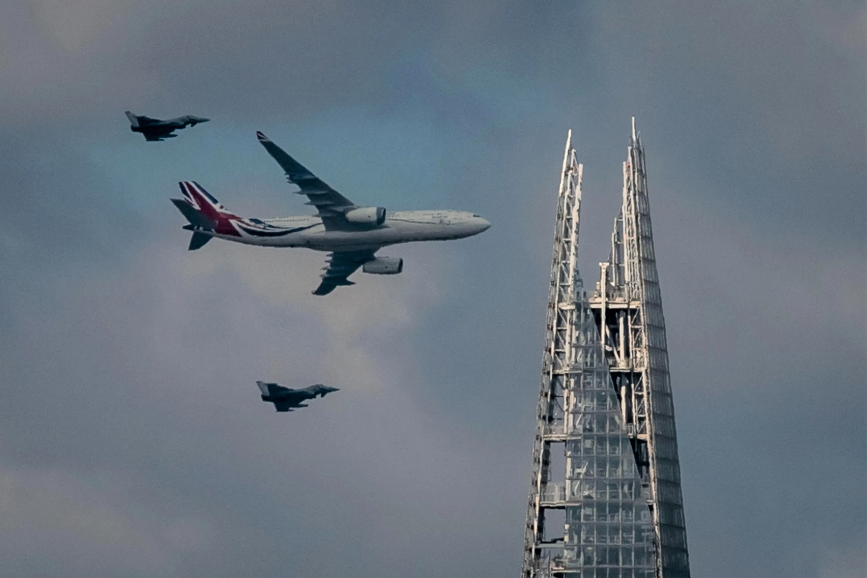 RAF flypast for the Prime Minister of Japan Fumio Kishida in London, UK on May 5, 2022. PM Boris Johnson will meet Fumio Kishida today, with defence and the war in Ukraine featuring heavily on the agenda and is expected to announce a “landmark defence partnership” known as the Reciprocal Access Agreement. To mark the occasion one Voyager Vespina and two Typhoon aircraft perform a flypast this morning, seen here passing tip of The Shard skyscraper building. (Photo by Guy Corbishley/Alamy Live News)