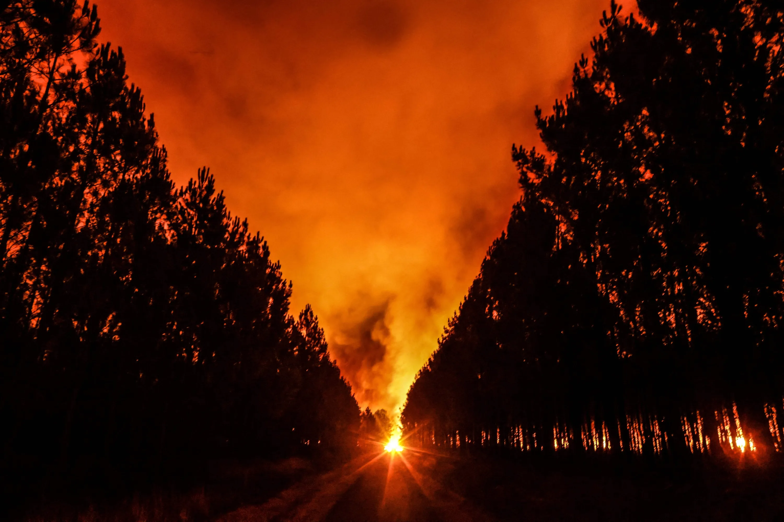 A picture taken overnight on August 11, 2022 shows the sky turning red as it is illuminated by flames at a wildfire near Belin-Beliet, southwestern France. French officials warned that flare-ups could cause a massive wildfire to further spread in the country's parched southwest, where fresh blazes have already blackened swathes of land this week. Prime Minister is expected to meet with authorities battling the Landiras blaze south of Bordeaux, and further reinforcements are expected for the 1,100 firefighters on site, the prefecture of the Gironde department said. (Photo by Thibaud Moritz/AFP Photo)