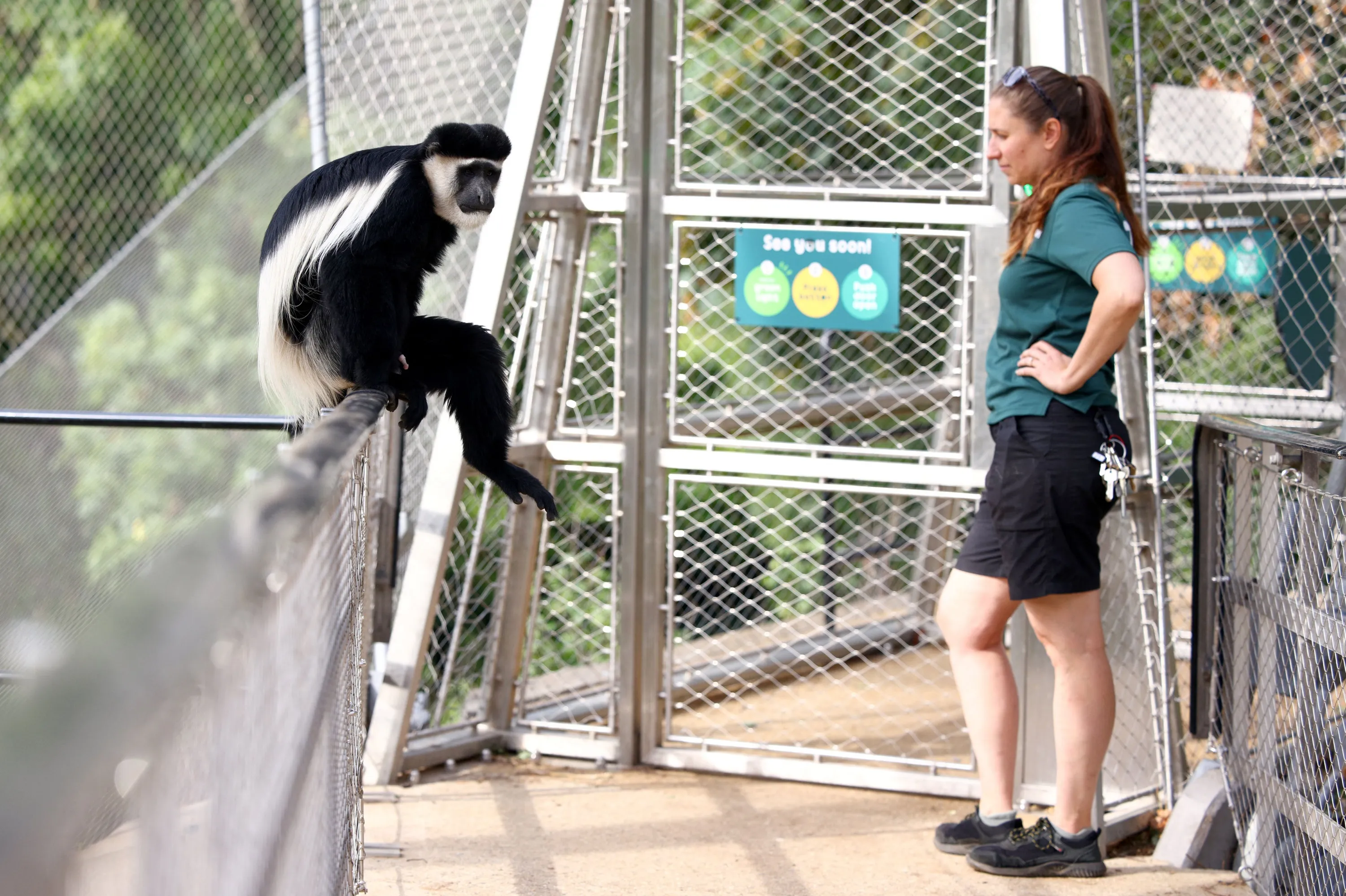 A Colobus monkey sits on a handrail next to an employee of London Zoo inside the new monkey valley enclosure in London, Britain on July 28, 2022. (Photo by Lisi Niesner/Reuters)
