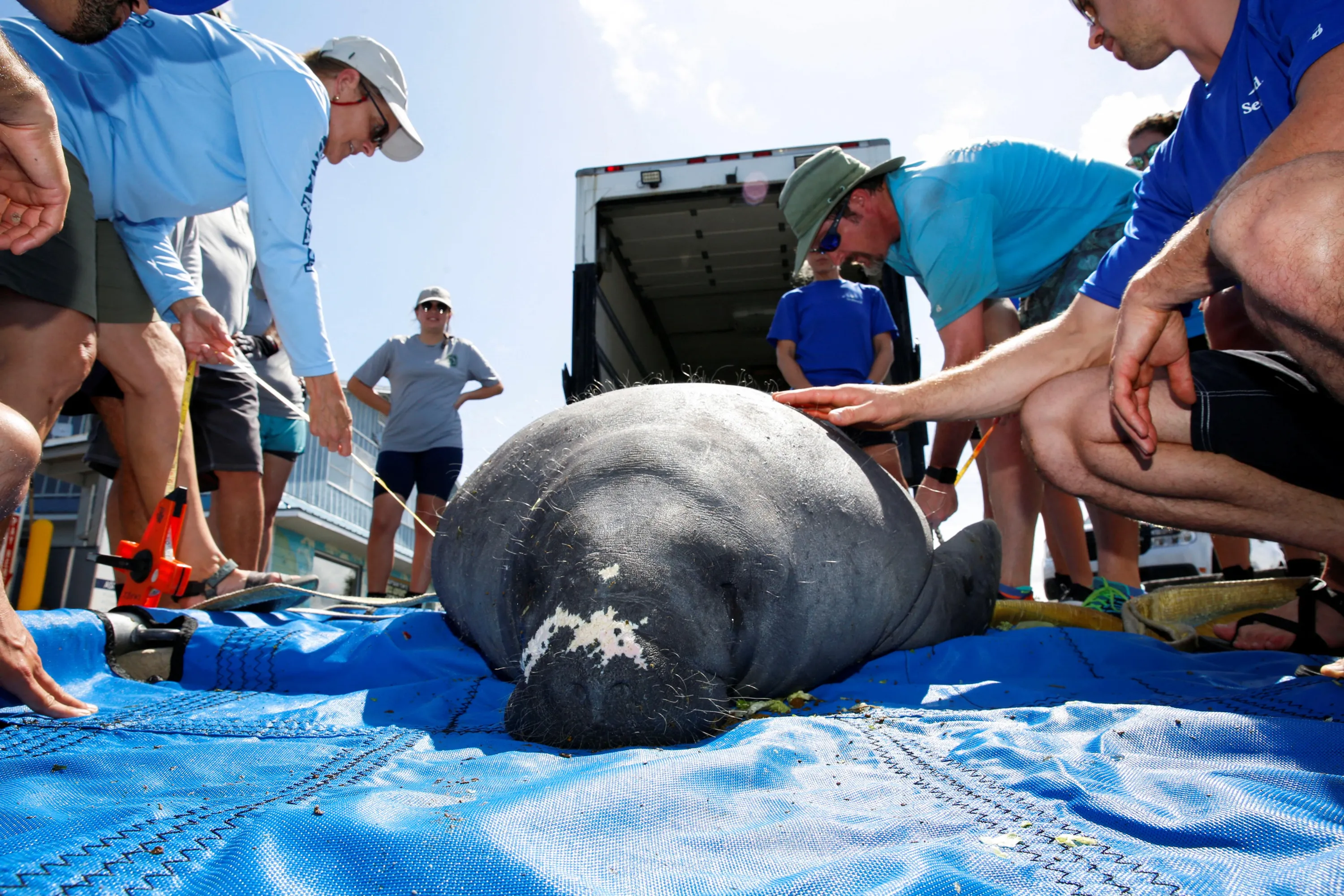 The SeaWorld Rescue team along with the U.S. Fish & Wildlife Service, and the Florida Fish and Wildlife Conservation Commission prepare to release a manatee, which had been found in Texas waters suffering from cold stress, flipper damage and other ailments before being rehabilitated in San Antonio for seven months, at Pete's Pier in Crystal River, Florida, U.S. July 27, 2022. (Photo by Octavio Jones/Reuters)