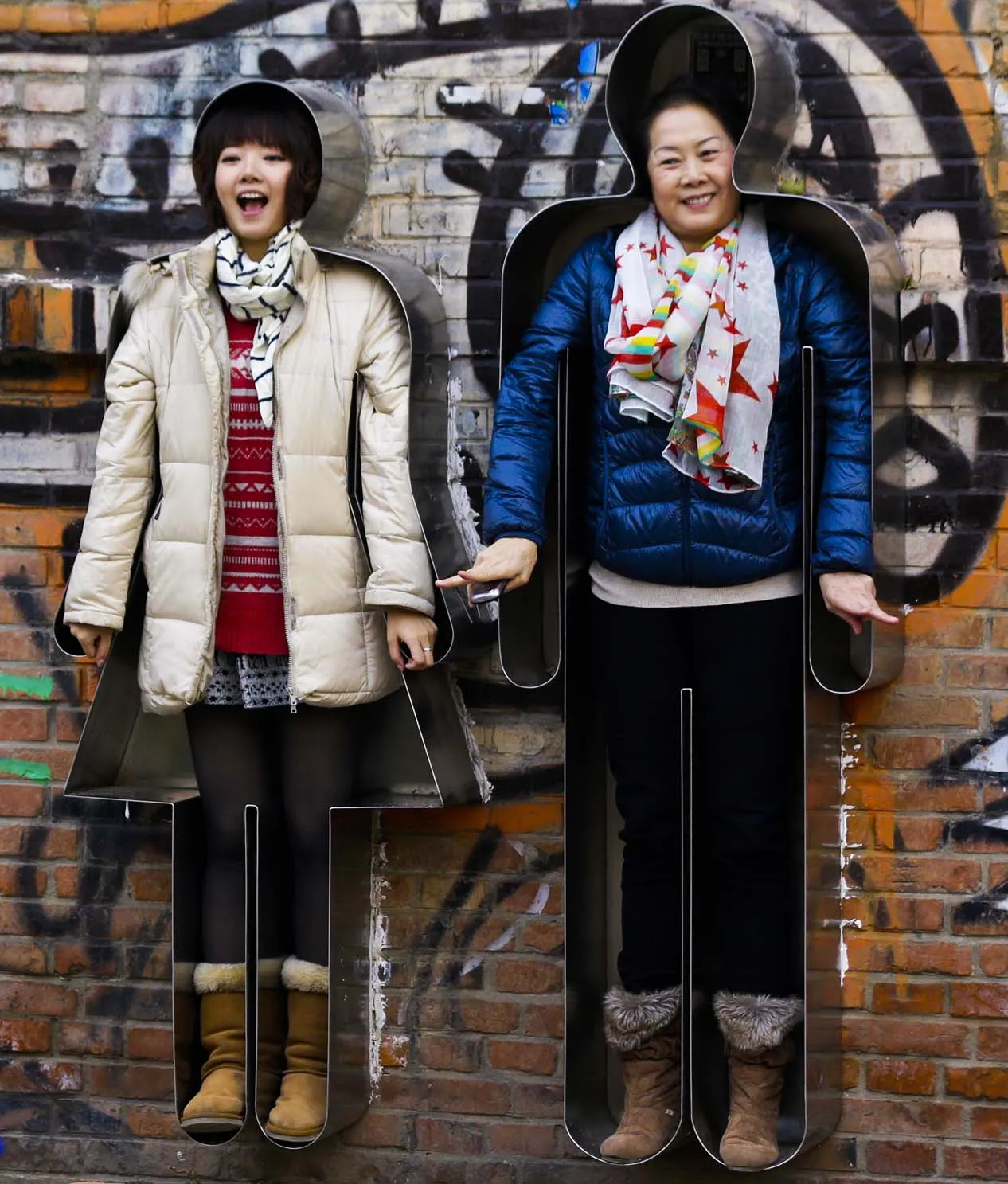 Women pose in body shaped metal frames titled “You and Me” by artist Zhang Zhaohui at the 798 Art District in Beijing, November 21, 2012. (Photo by Lee Jin-man/Associated Press)