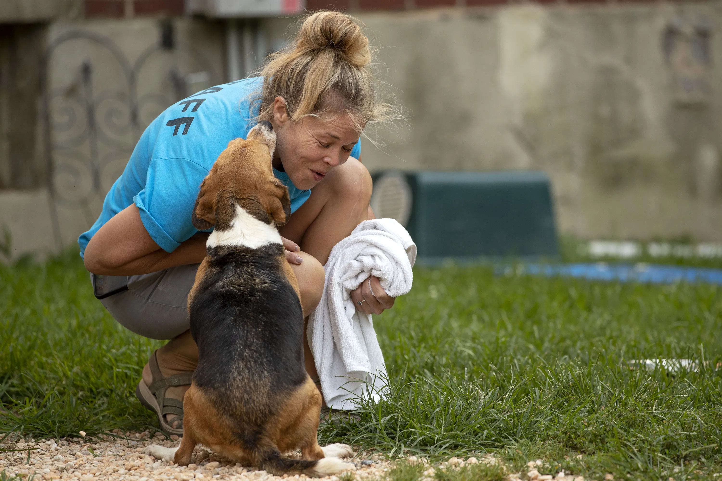 Sue Bell laughs as she is licked by a beagle at Homeward Trails Animal Rescue in Fairfax, Virginia on July 21, 2022. (Photo by Ryan M. Kelly for The Washington Post)