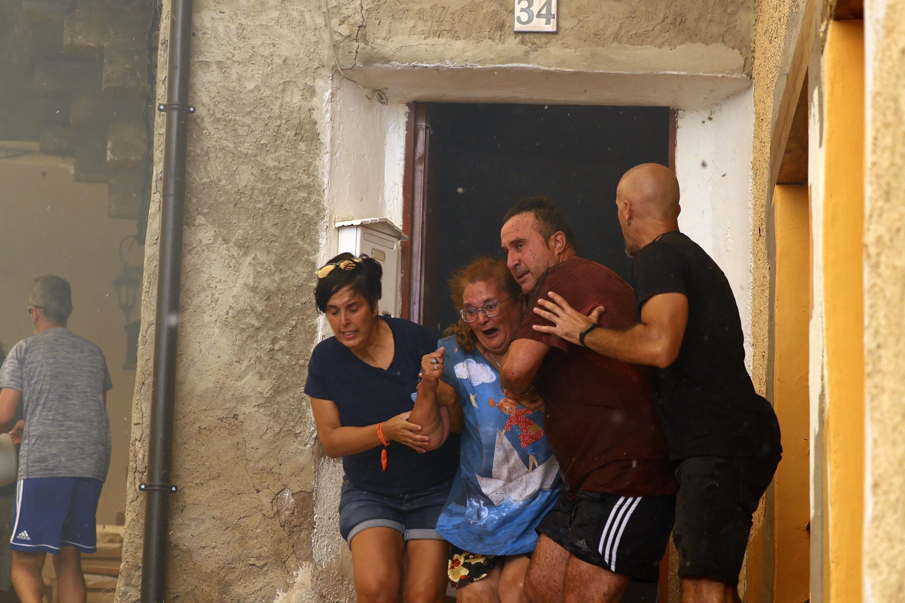 A woman is helped out of a house by neighbours in Anon de Moncayo, Spain on Saturday August 13, 2022. A large wildfire in northeast Spain grew rapidly overnight and was burning out of control. It has already forced the evacuation of eight villages and 1,500 people in Zaragoza province. A local government official said Sunday that the situation was critical in the town of Añon de Moncayo and the priority for the 300 firefighters fighting the blaze was to protect human lives and villages. (Photo by Fabian Simon/Europa Press via AP Photo)