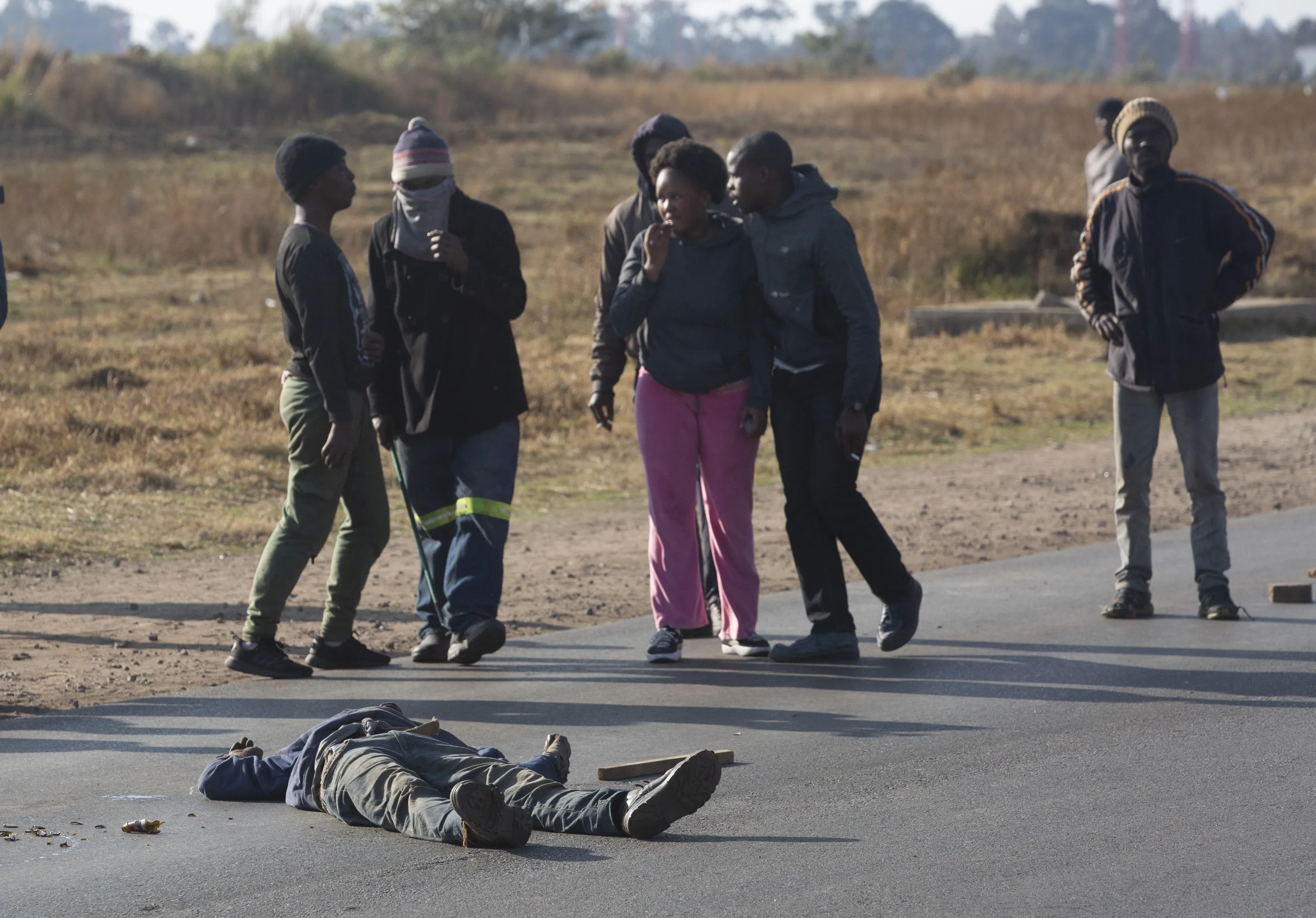 Community members stand around an injured illegal gold miner near Krugersdorp, South Africa, Thursday, August 4, 2022. Community members beat suspected illegal miners with sticks and set fire to their camps following the alleged gang rapes of eight women by miners last week. (Photo by Denis Farrell/AP Photo)
