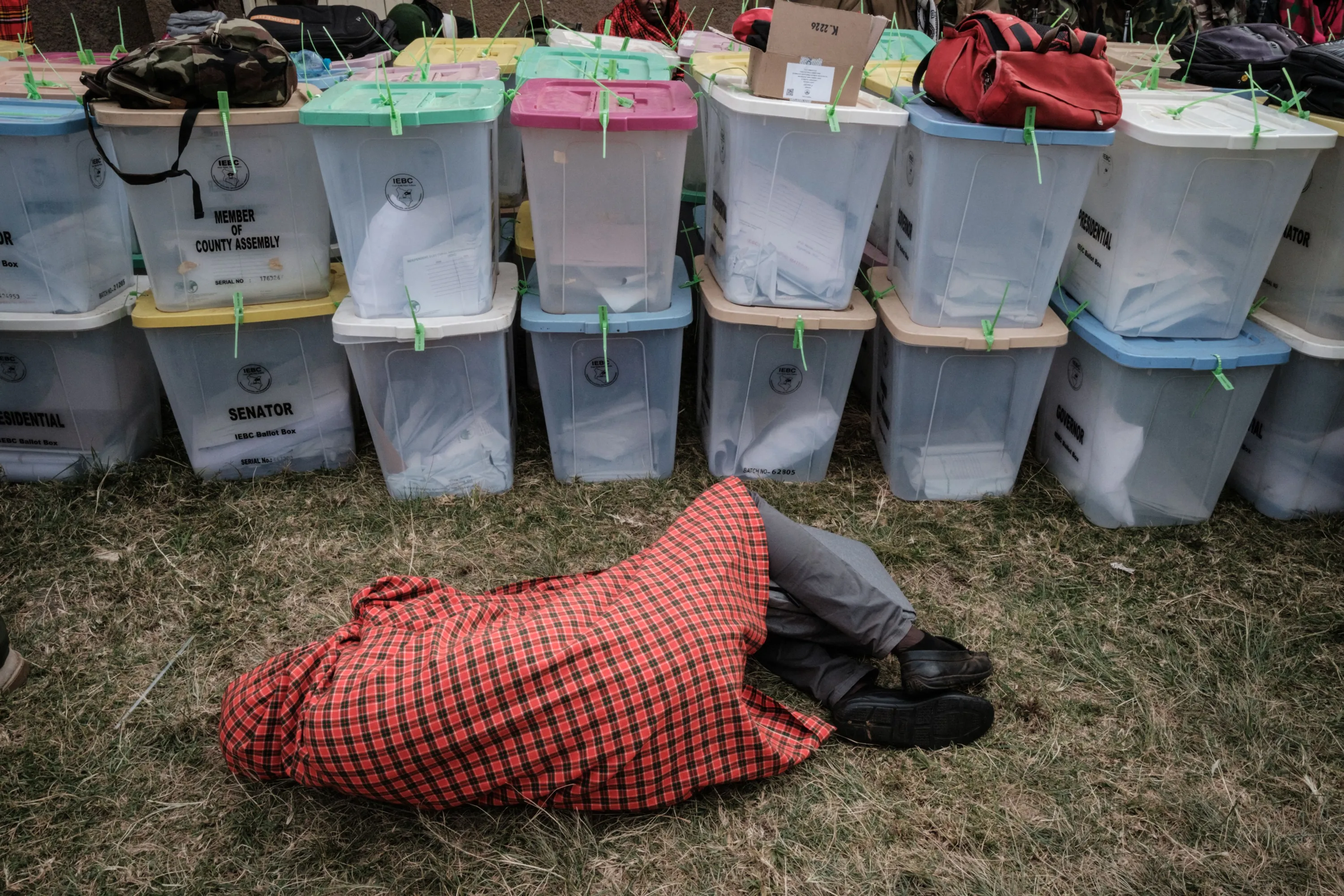 Presiding officers sleeps next to ballot boxes as they wait to return all electoral materials following Kenya's general election at the tallying center in Kilgoris on August 10, 2022. (Photo by Yasuyoshi Chiba/AFP Photo)
