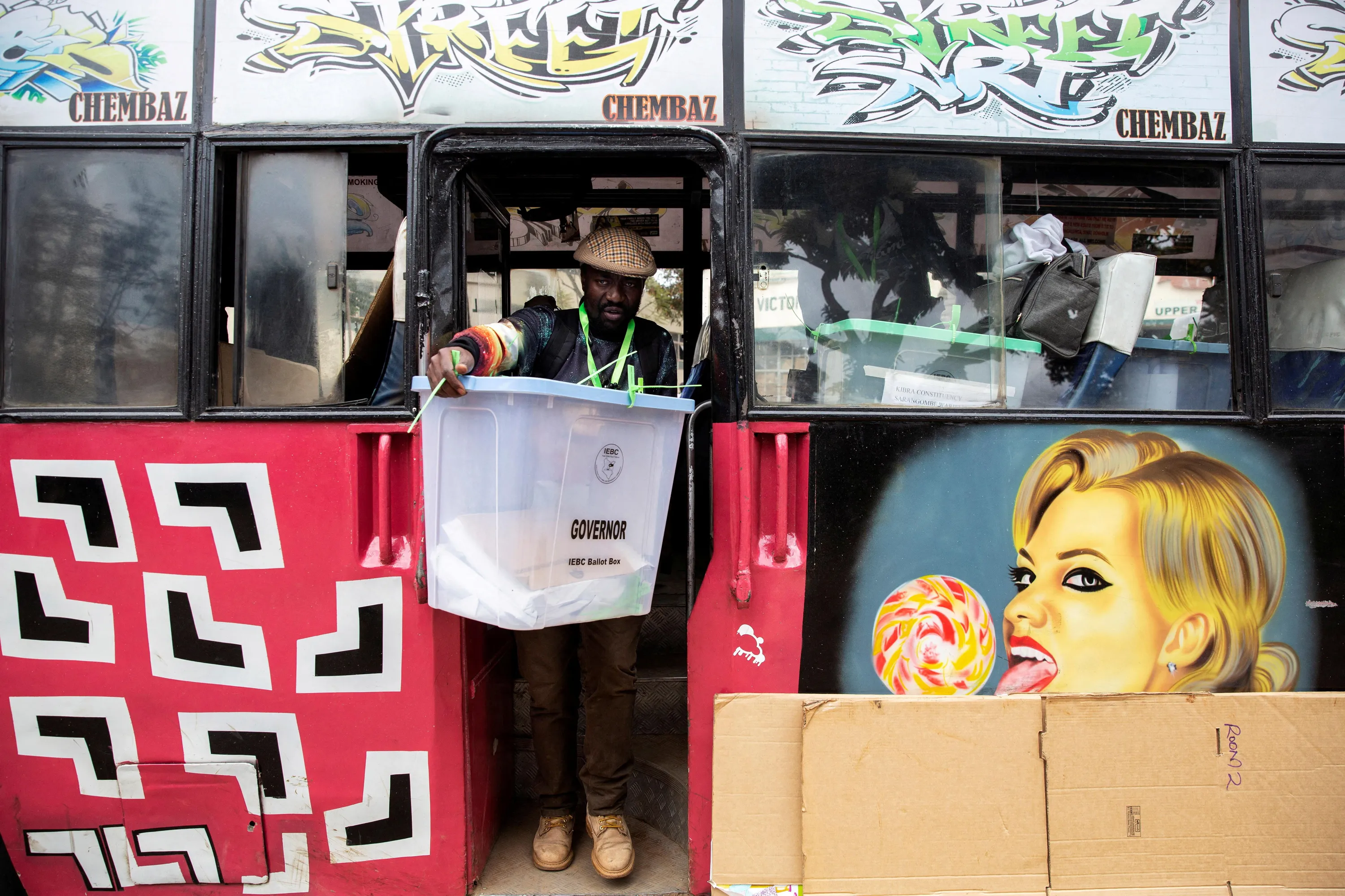 A man carries ballots from a bus after arriving at an Independent Electoral and Boundaries Commission (IEBC) tallying centre after the general election in Nairobi, Kenya on August 10, 2022. (Photo by James Oatway/Reuters)