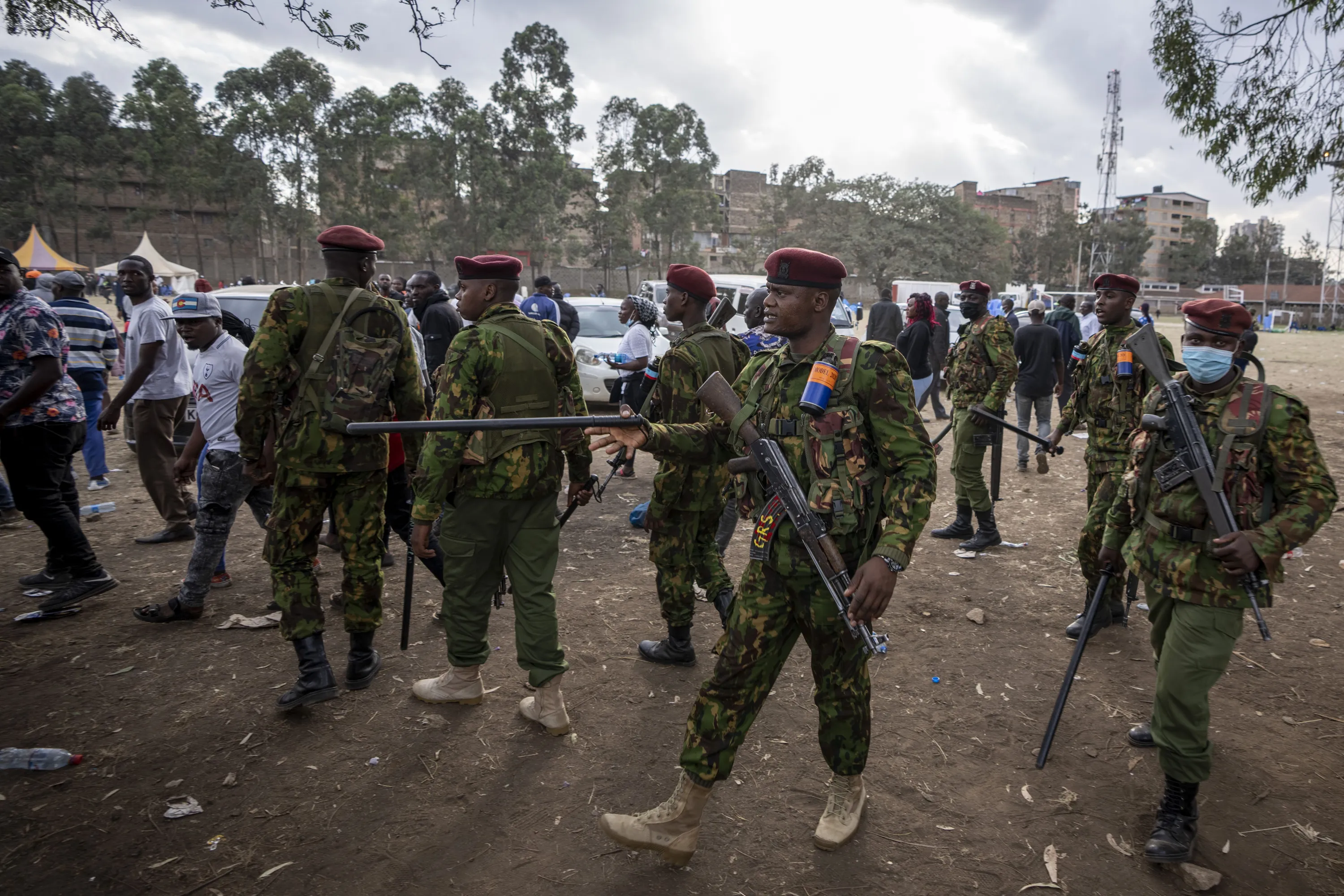 A police officer gestures indicating people to get back as police try to push back an angry crowd, after a few ballot boxes were discovered with their seals broken, at a tallying center in the Mathare area of Nairobi, Kenya Wednesday, August 10, 2022. Kenyans are waiting for the results of a close presidential election in which the turnout was lower than usual. (Photo by Ben Curtis/AP Photo)